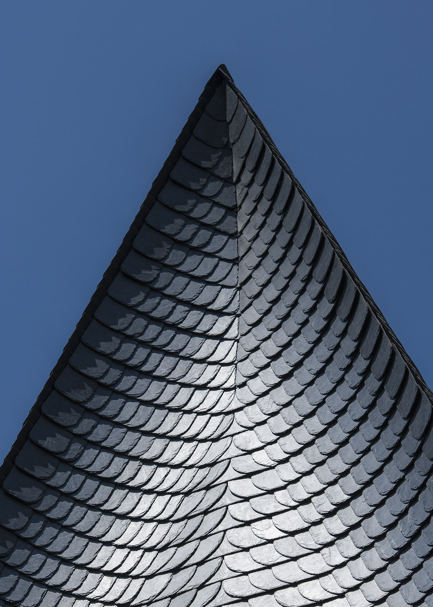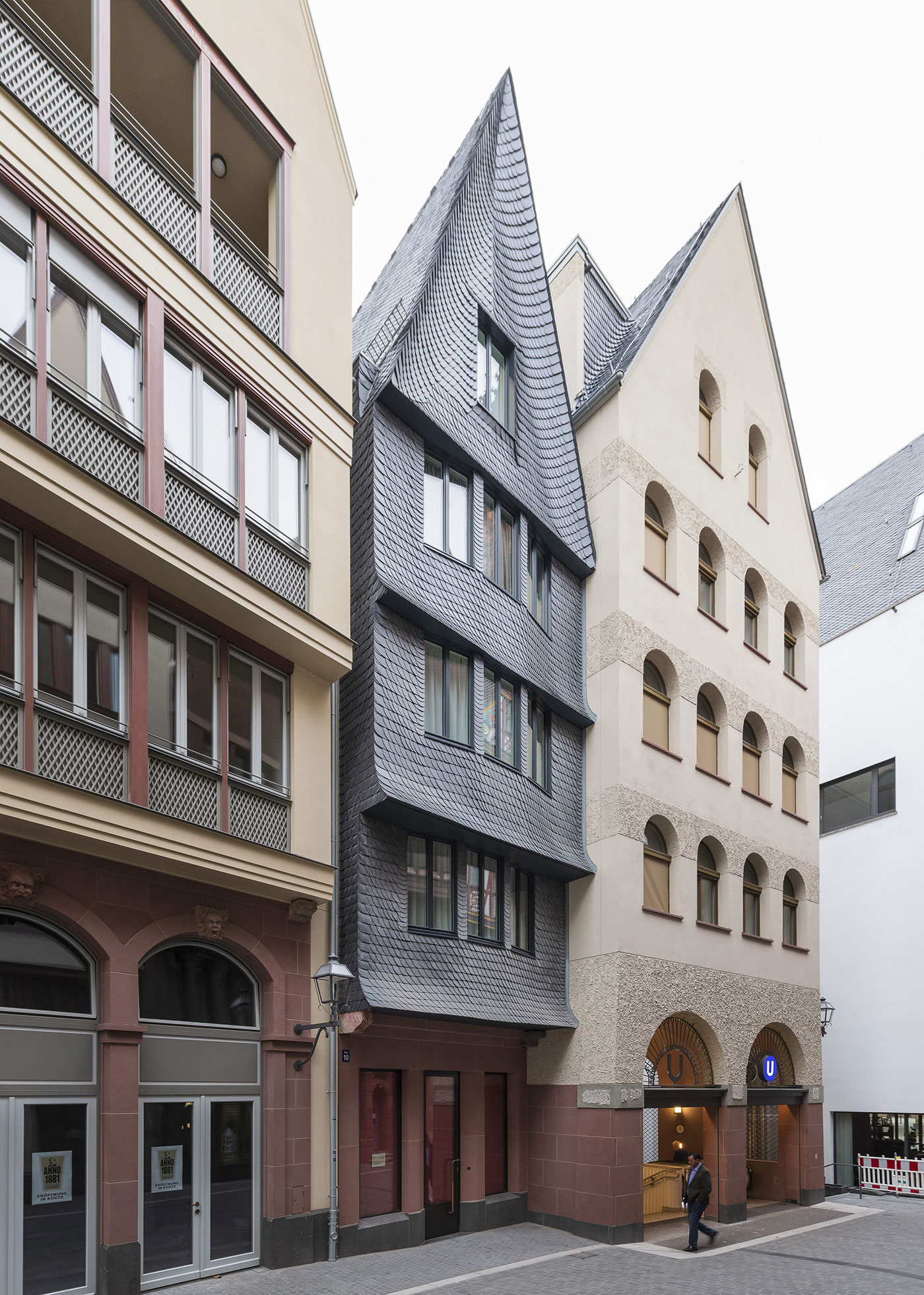 Ziel des Dom-Römer-Projekts war es auf historischer Parzelle durch zeitgenössische Neubauten ein ganzes Altstadtviertel wiedererstehen zu lassen. Das nur gut fünf Meter breite Haus füllt die Leerstelle eines einstigen Fachwerkbaus. Die Schieferfassade mit Spitzgiebel, vorspringende Geschosse und der rote Mainsandstein des Gebäudesockels sind Reminiszenzen an den historischen Vorgänger. Durch das Zusammenspiel von plastischer Form und Schieferschindeln gewinnt die Fassade zur Straße an besonderer Qualität und erinnert an ein eng anliegendes Paillettenkleid. Das Haus ist als Wohn- und Geschäftsgebäude konzipiert. Im Erdgeschoss ist die gewerbliche Nutzung angeordnet. Die Wohneinheit bietet im 1. OG einen repräsentativen Wohn- und Essbereich, im 2. OG intimere Wohnräume inkl. Gästezimmer sowie im 3. OG und im Dachgeschoss weitere Wohn- bzw. Schlafzimmer.