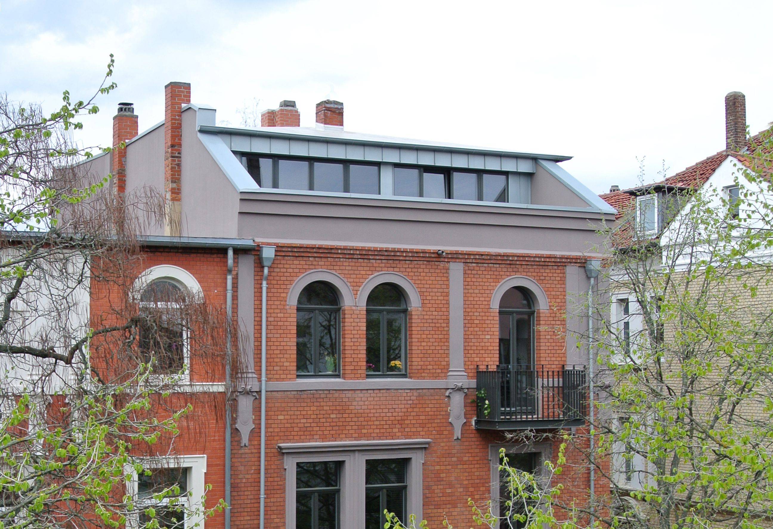 Die bestehenden Wohnungen in dem viergeschossigen, um 1896 errichteten Mehrfamilienhaus wurden durch den Anbau von Balkonen und den Umbau des Dachgeschosses erweitert. Die neuen Balkone wurden entsprechend der Gestaltung der repräsentativen Straßenfassade vom massiven Sockelgeschoss zum bekrönenden 3. Obergeschoss mit Rundbogenöffnungen im Sockelbereich massiv und nach oben in ihrer Konstruktion leichter werdend entwickelt. Das nach dem 2. Weltkrieg nachlässig wieder aufgebaute Dachgeschoss wird zu einem Sockelgeschoss rückgebaut und bildet straßenseitig eine Dachterrasse mit einer von Gesimsbändern geprägten Brüstung als angemessenen oberen Abschluss des Gebäudes.