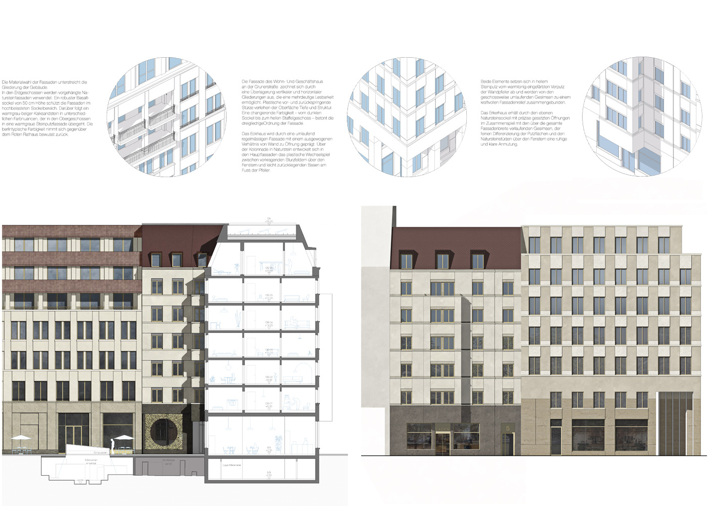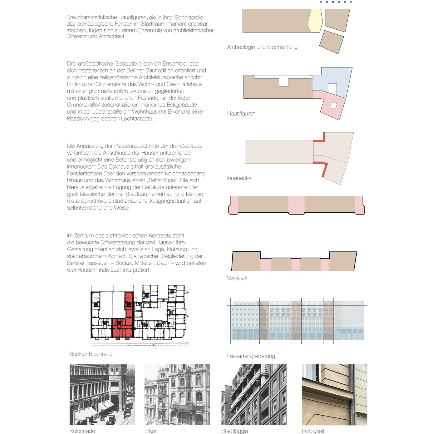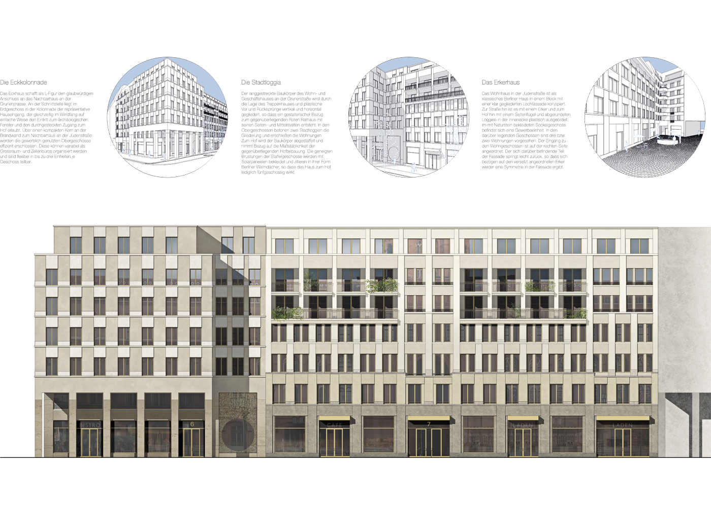 Drei großstädtische Gebäude bilden ein Ensemble, das sich gestalterisch an der Berliner Bautradition orientiert und zugleich eine zeitgenössische Architektursprache spricht. Die Fassaden reagieren jeweils auf Lage und Nutzung, variieren typologisch und folgen dennoch einer gemeinsamen Dreigliederung, die das Ensemble architektonisch zusammenbindet.