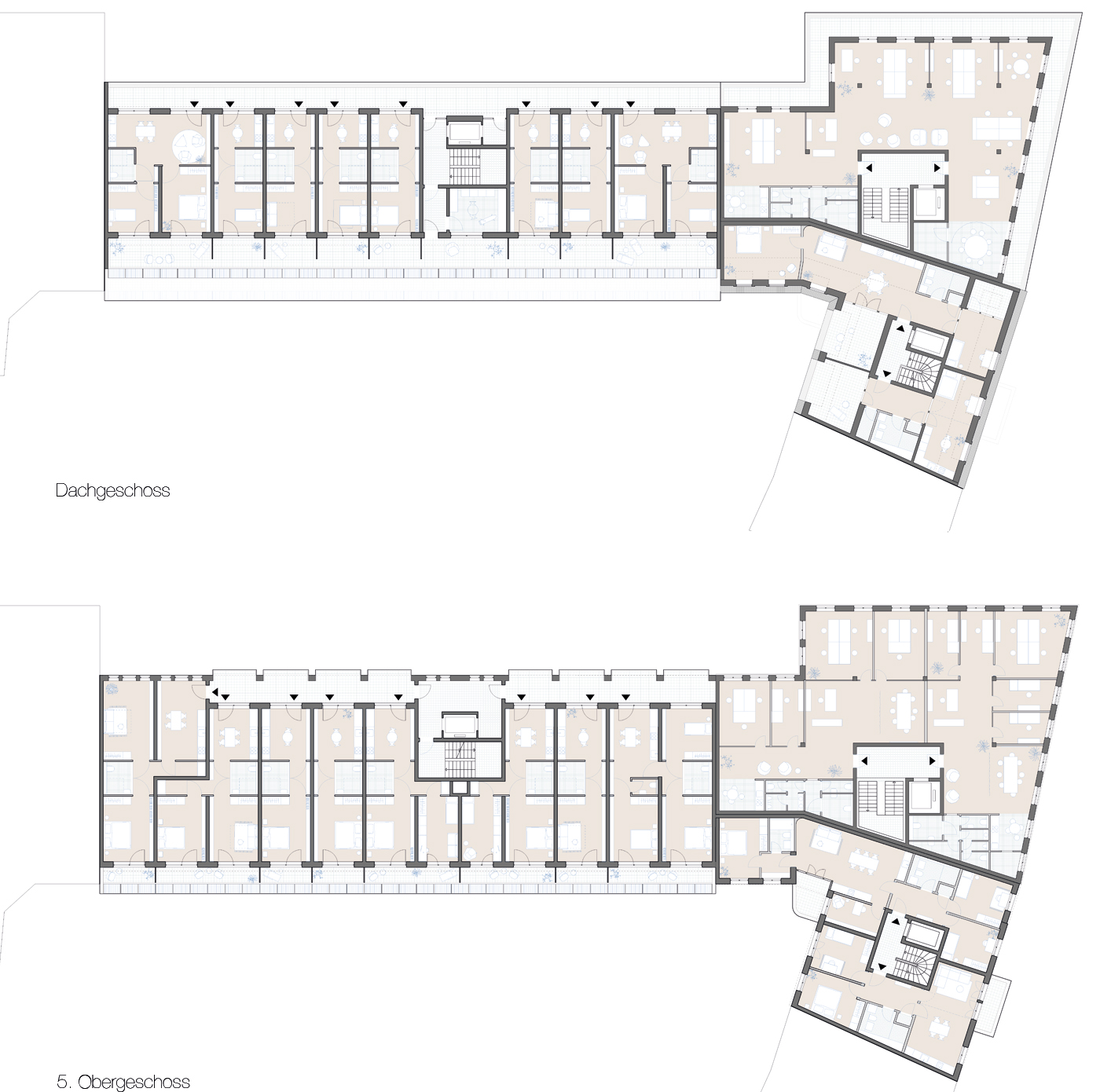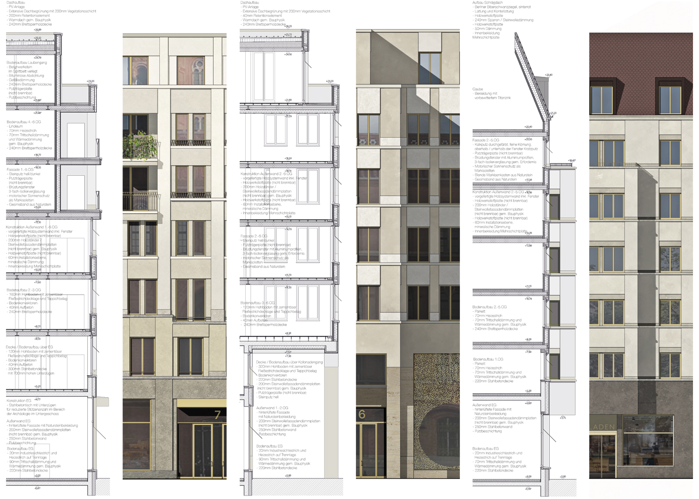 Die Neubauten sind als ressourcenschonende Holz-Hybridkonstruktion mit minimiertem Betonanteil und hohem Vorfertigungsgrad geplant. Naturstein im Sockelbereich und warmgrauer Steinputz in den Obergeschossen prägen die zurückhaltende, berlintypische Materialität.