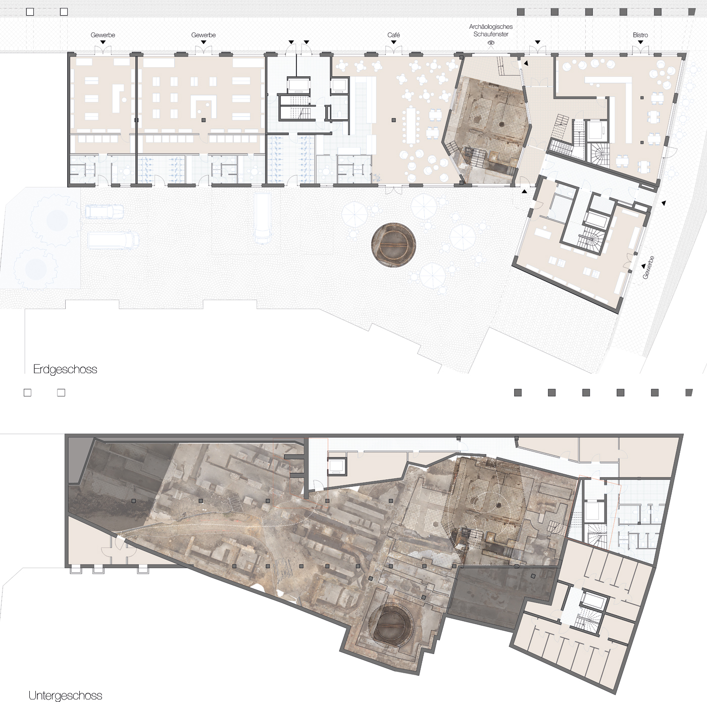 Im Zentrum liegt das archäologische Fenster, das als durchgehende, begehbare Halle in den Gebäudekomplex integriert ist und über ein markantes rundes Fensterelement in den Stadtraum wirkt.