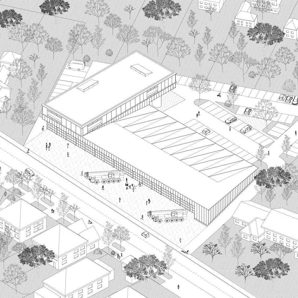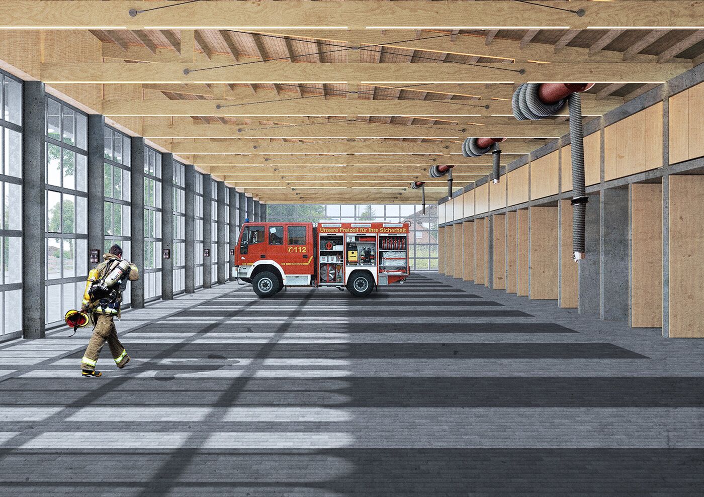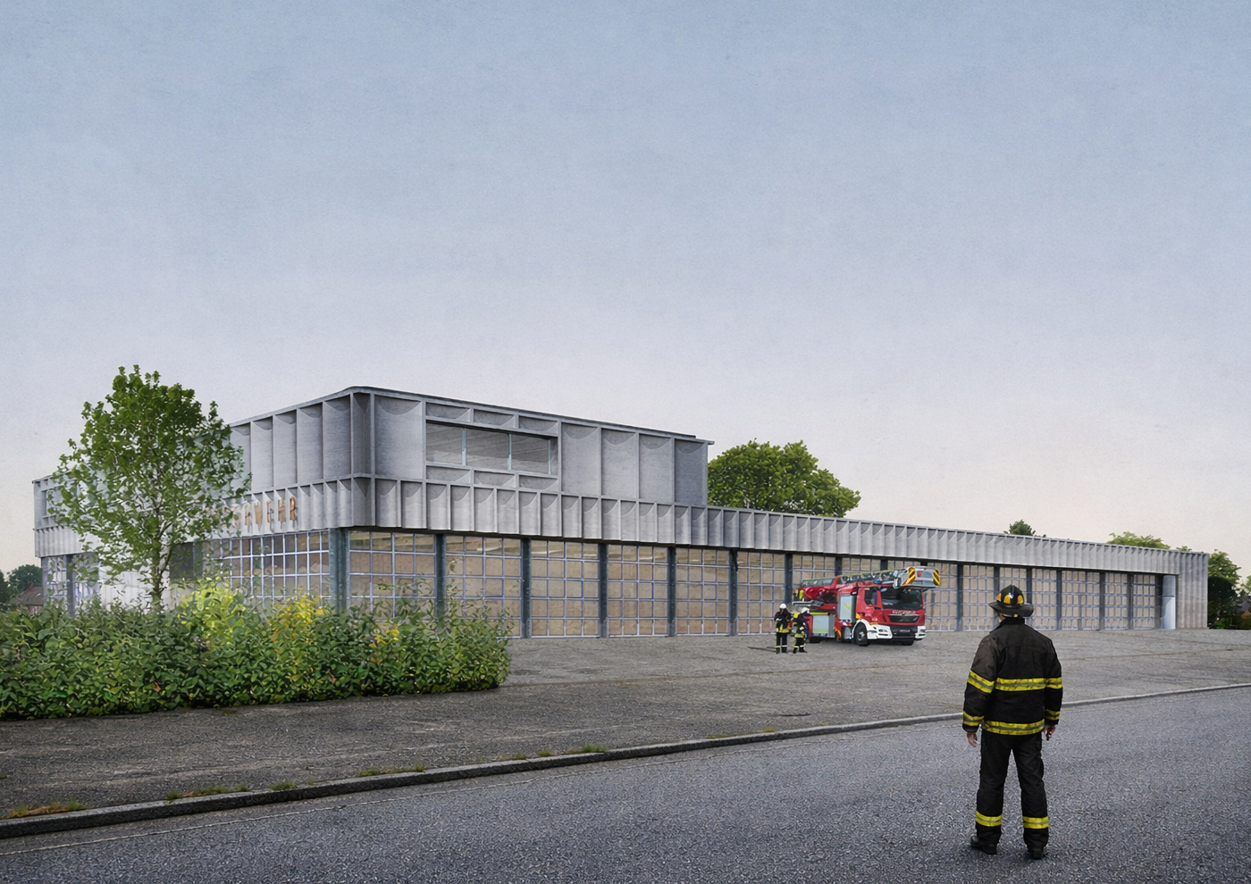 Das Feuerwehrgebäude wird parallel zur Hamburger Straße gesetzt. Richtung Norden zum Stadtzentrum wird ein Kopfbau geplant, der gemeinsam mit den Toren der Fahrzeughalle eine identitätsstiftende Adresse bildet. Trotz der funktional nötigen Baumasse der Wache gliedert sie sich durch das Fassadenbild und das auf die Halle aufgesetzte zweite Obergeschoss gut in den umgebenden Kontext ein. Die Alarmausfahrt erfolgt optimal direkt auf die Hamburger Straße. Vor der Fahrzeughalle werden die nach DIN notwendigen Flächen zur Aufstellung der Fahrzeuge sowie eine Umfahrung auf eigenem Grundstück nachgewiesen, sodass auch außerhalb der Alarmfälle ein reibungsloser Betrieb ohne Inanspruchnahme der öffentlichen Verkehrsflächen möglich ist.