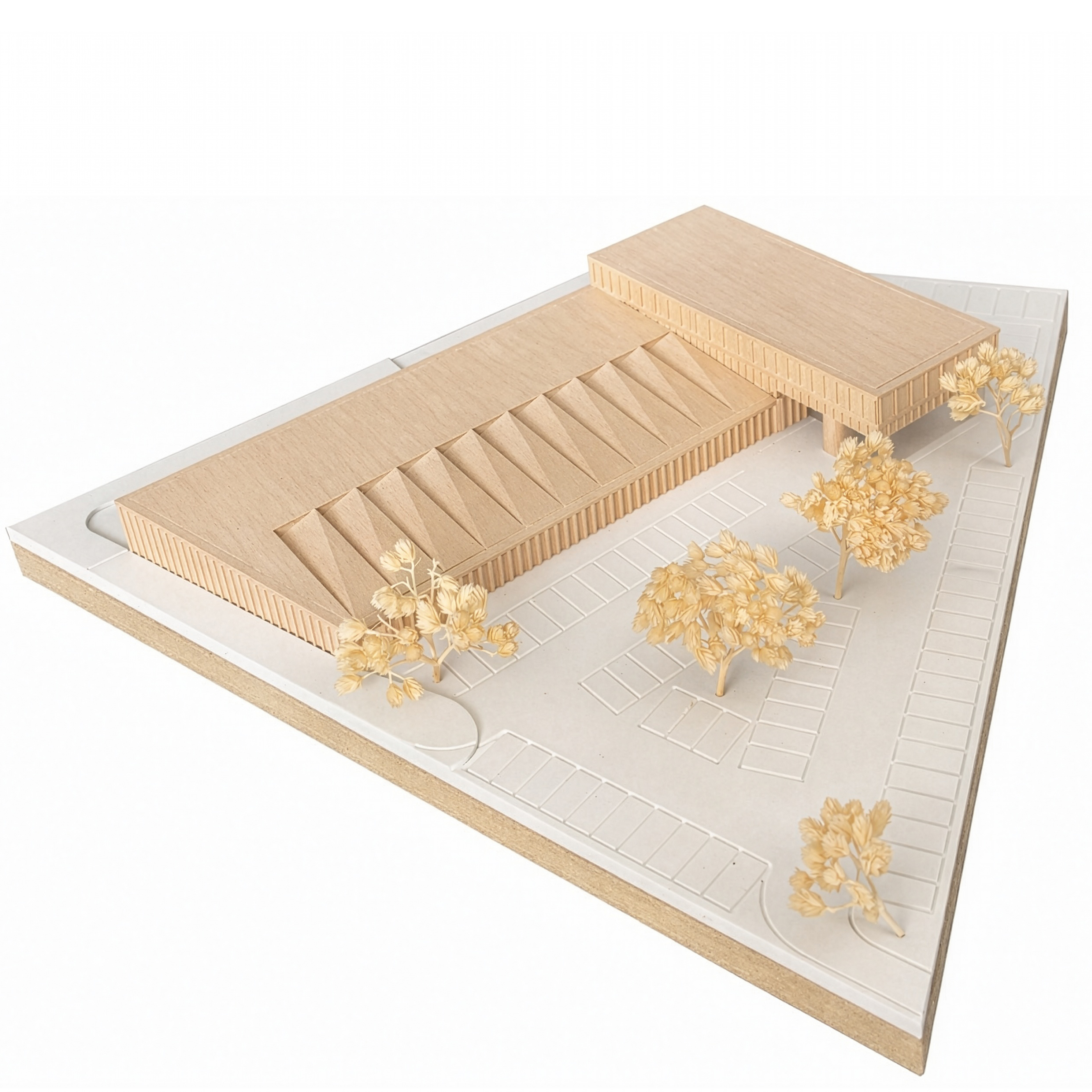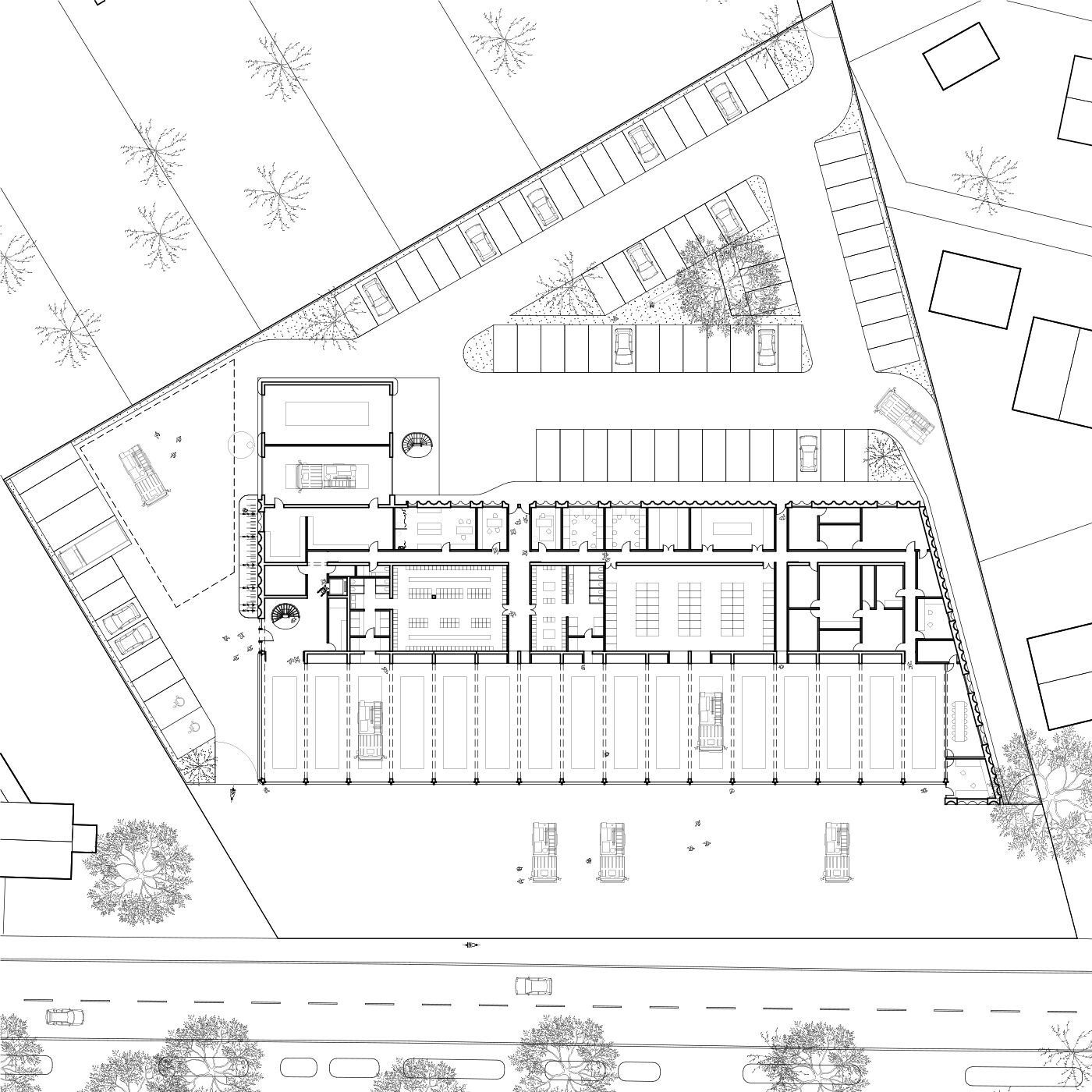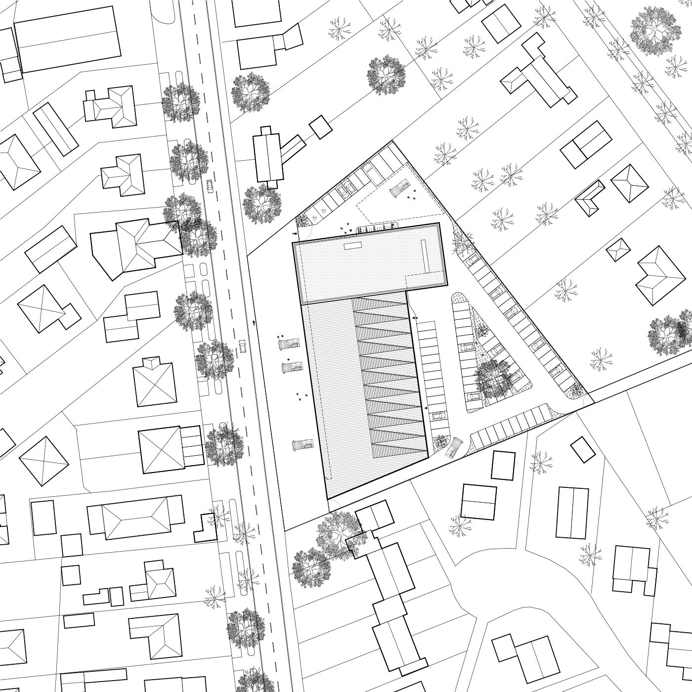 Das Feuerwehrgebäude wird parallel zur Hamburger Straße gesetzt. Richtung Norden zum Stadtzentrum wird ein Kopfbau geplant, der gemeinsam mit den Toren der Fahrzeughalle eine identitätsstiftende Adresse bildet. Trotz der funktional nötigen Baumasse der Wache gliedert sie sich durch das Fassadenbild und das auf die Halle aufgesetzte zweite Obergeschoss gut in den umgebenden Kontext ein. Die Alarmausfahrt erfolgt optimal direkt auf die Hamburger Straße. Vor der Fahrzeughalle werden die nach DIN notwendigen Flächen zur Aufstellung der Fahrzeuge sowie eine Umfahrung auf eigenem Grundstück nachgewiesen, sodass auch außerhalb der Alarmfälle ein reibungsloser Betrieb ohne Inanspruchnahme der öffentlichen Verkehrsflächen möglich ist.