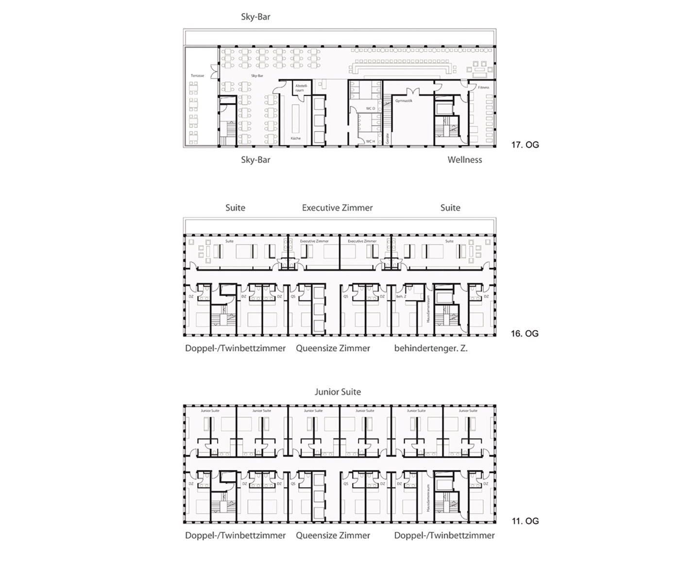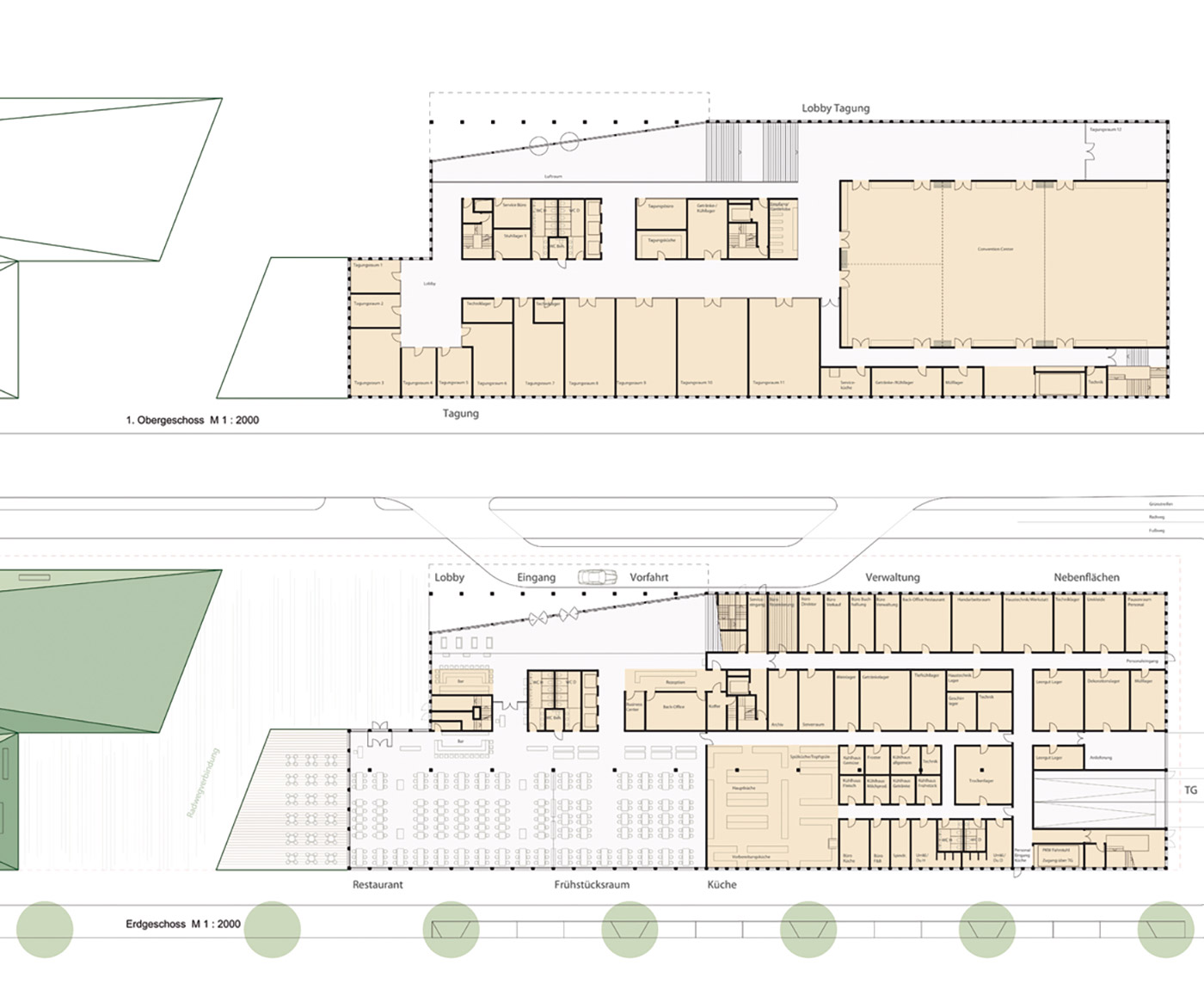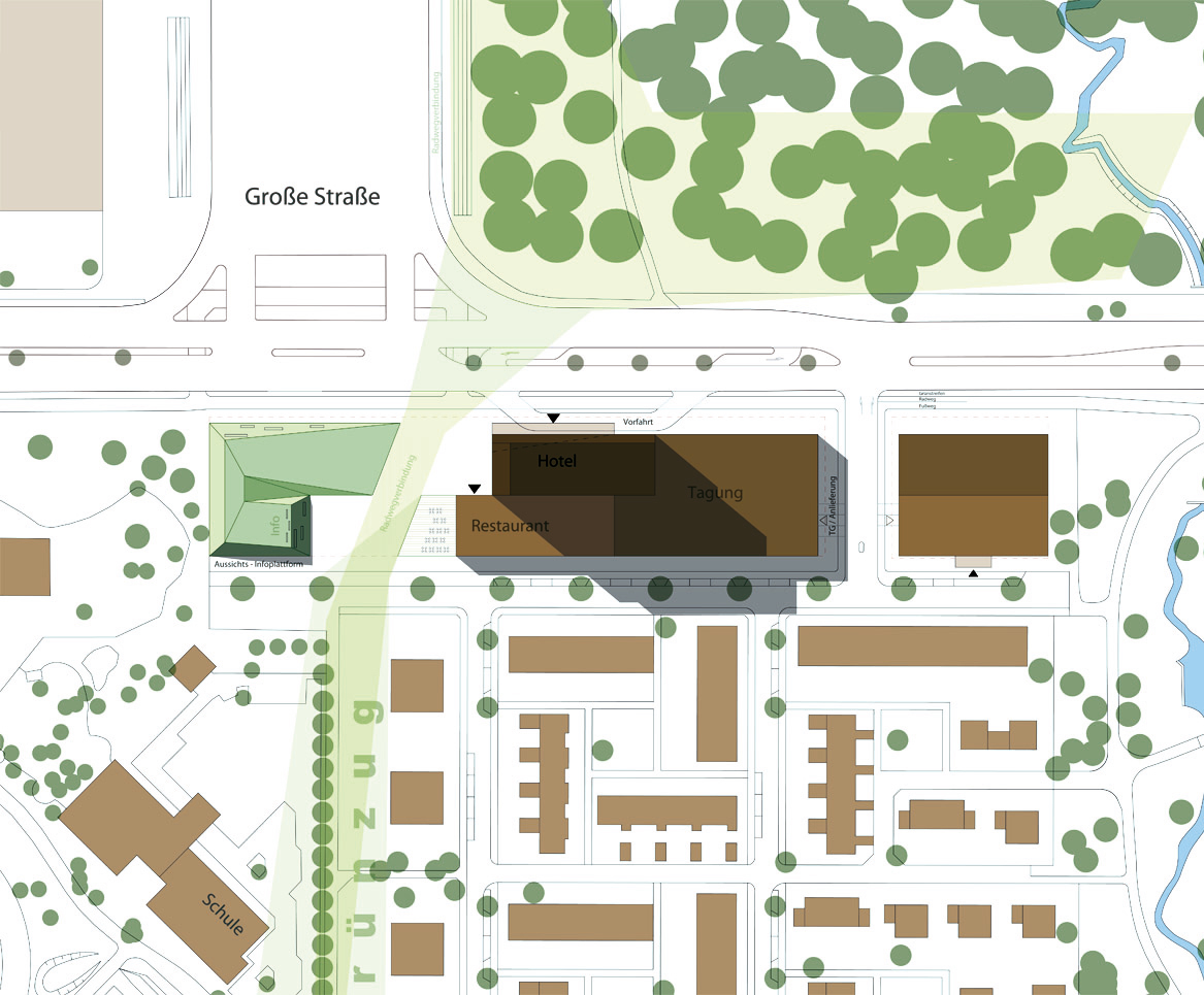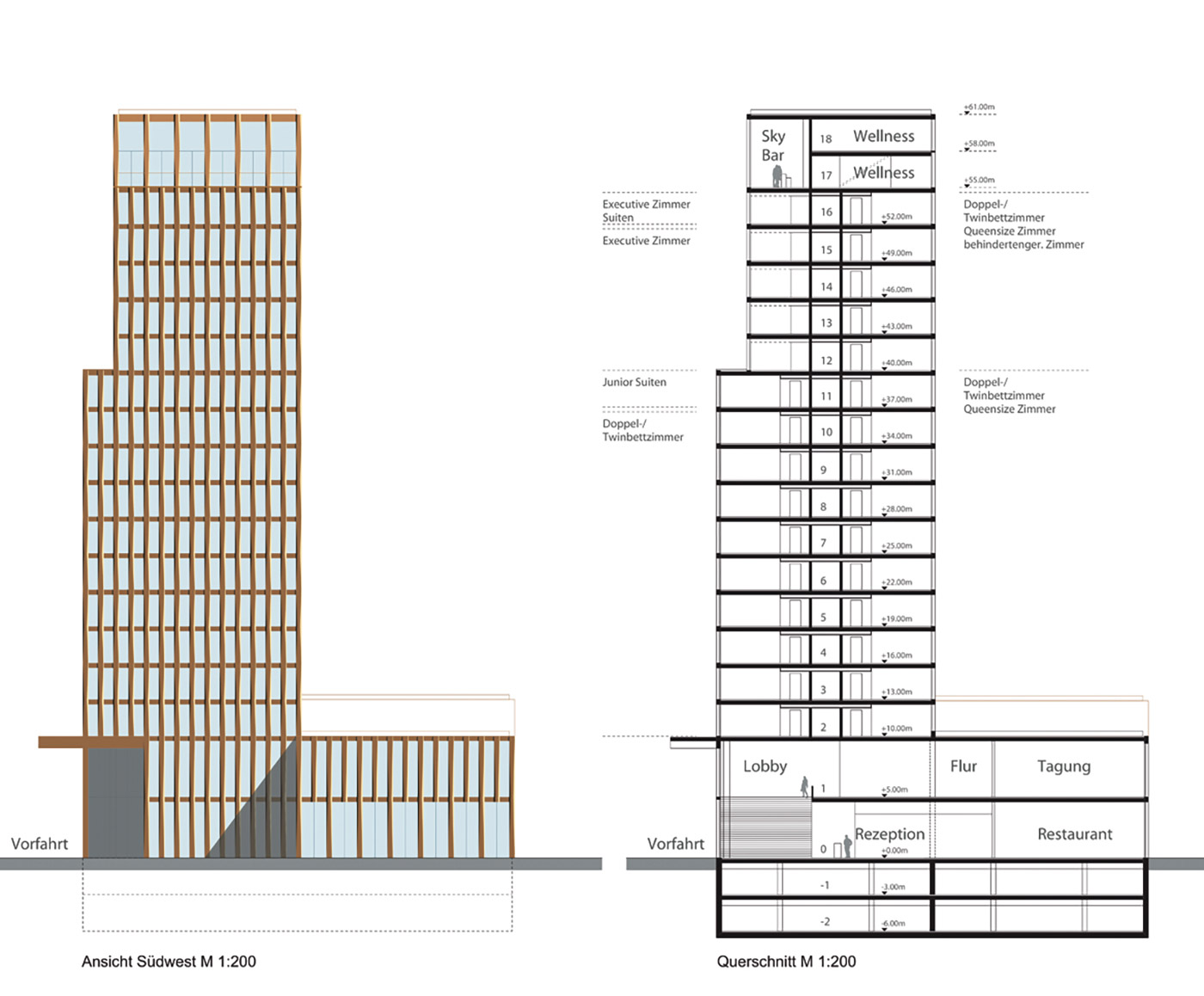 Auf die besondere Lage des Grundstücks am Ende der „Großen Straße“, die im Rahmen des „Reichsparteitaggeländes“ angelegt wurde, reagiert der Entwurf, indem er eine exzentrische Stellung der Bebauung vorsieht. Das Hotel stellt eine Abfolge höhenmäßig gestaffelter Baukörper dar. Als Fassadenmaterial wird Kupferblech verwendet. Durch das Ansetzen von Patina und die damit verbundenen farblichen Veränderungen entsteht ein Fassadenspiel, dass dem Gebäude eine besondere Qualität verleiht. Dieses Fassadenspiel wird durch die geschossweise Neigung der Fensterlaibung gestärkt.