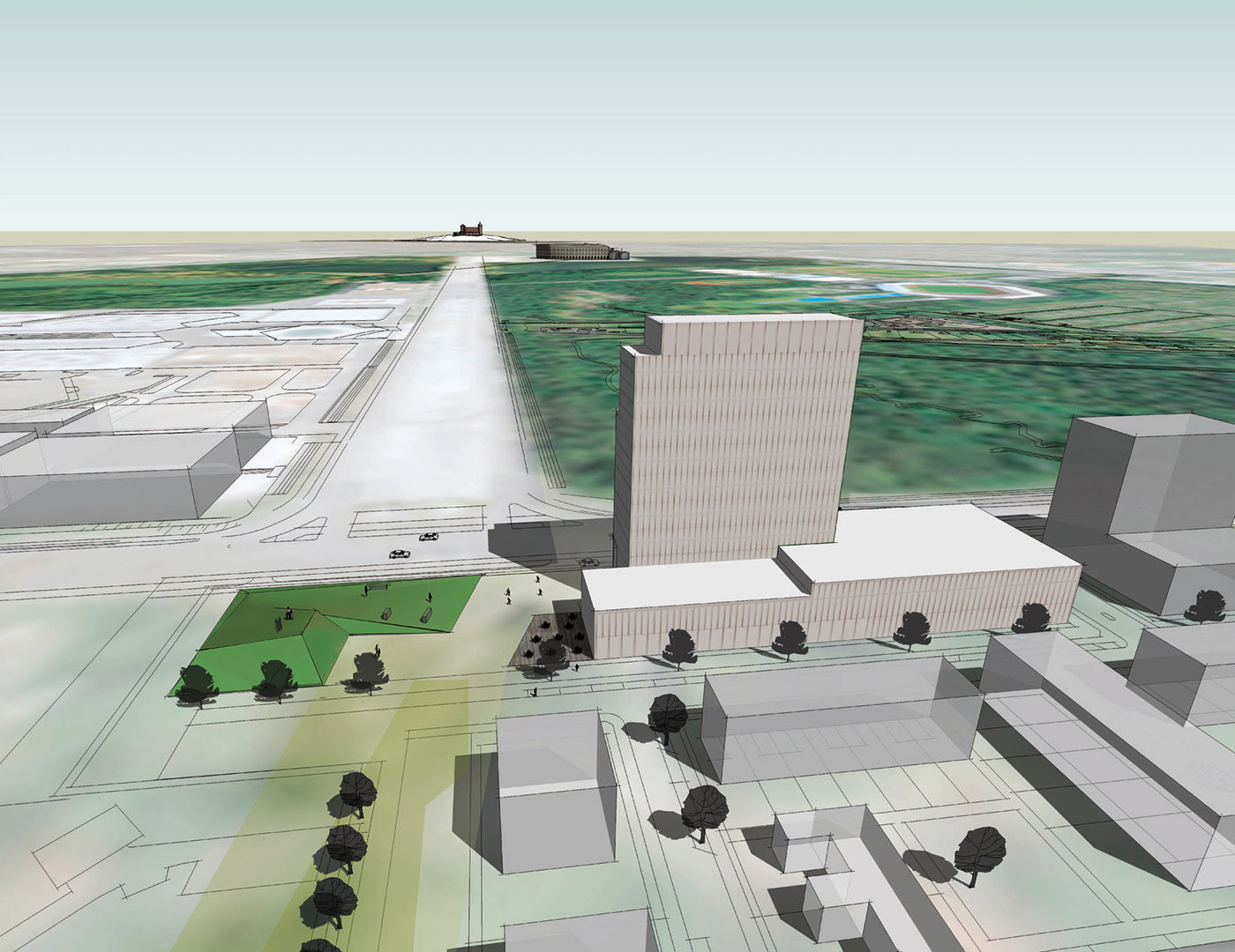 Neubau Hotel-Hochhaus in Nachbarschaft zur ehemaligen „Großen Straße“ des Nürnberger „Reichsparteitagsgeländes“