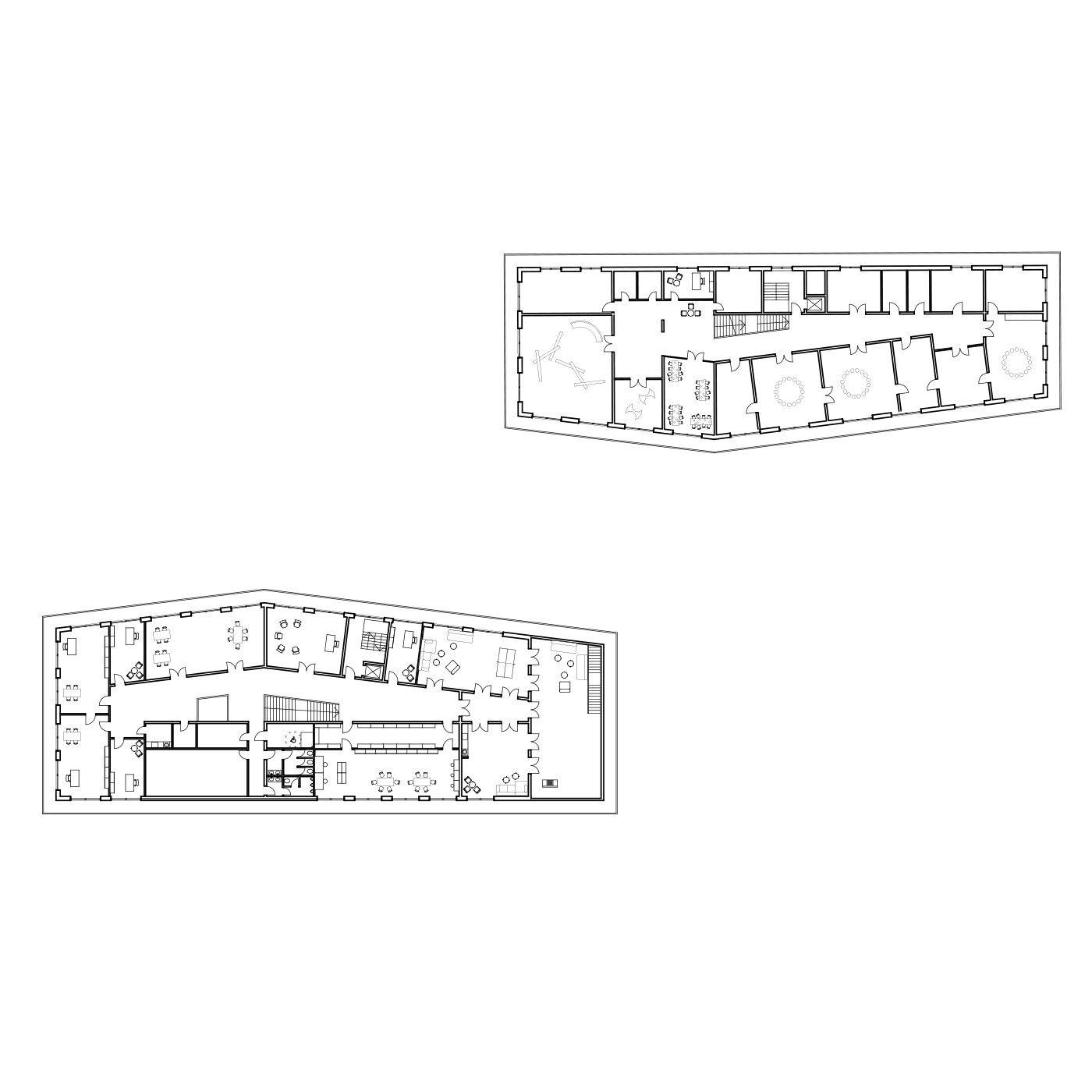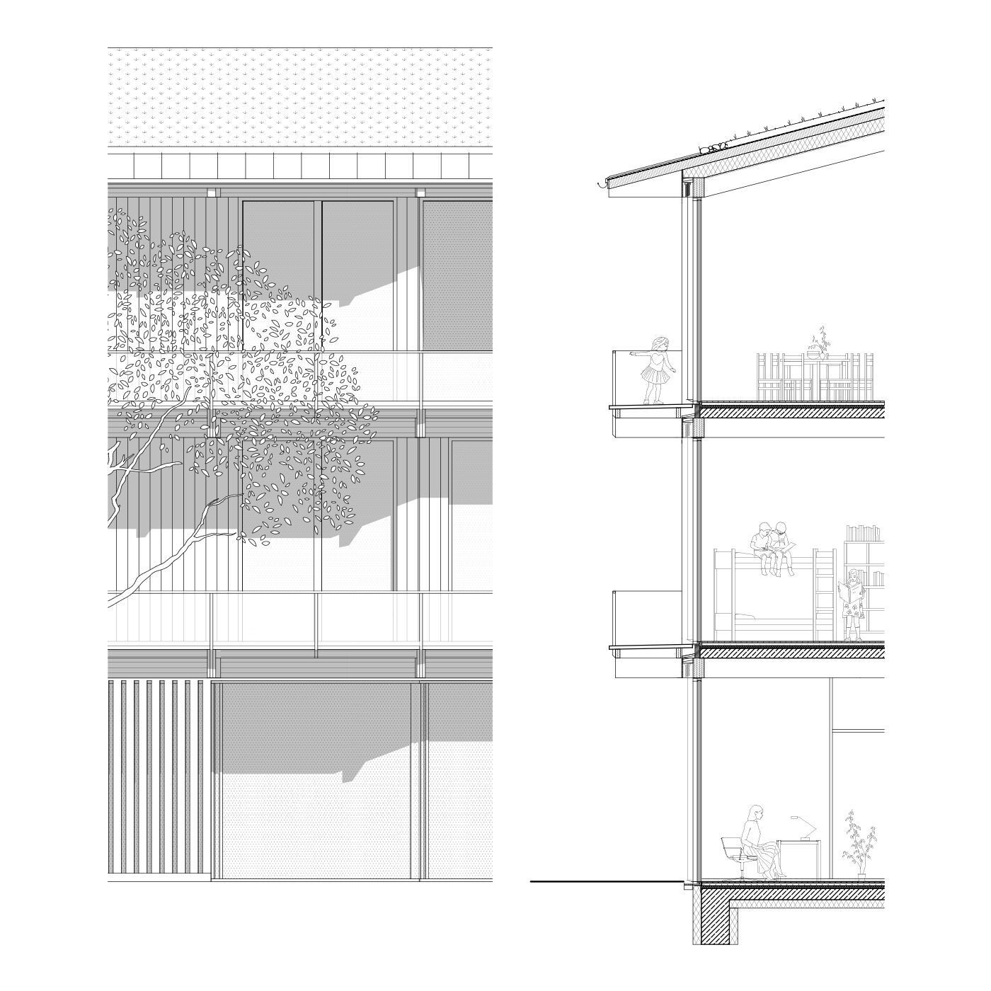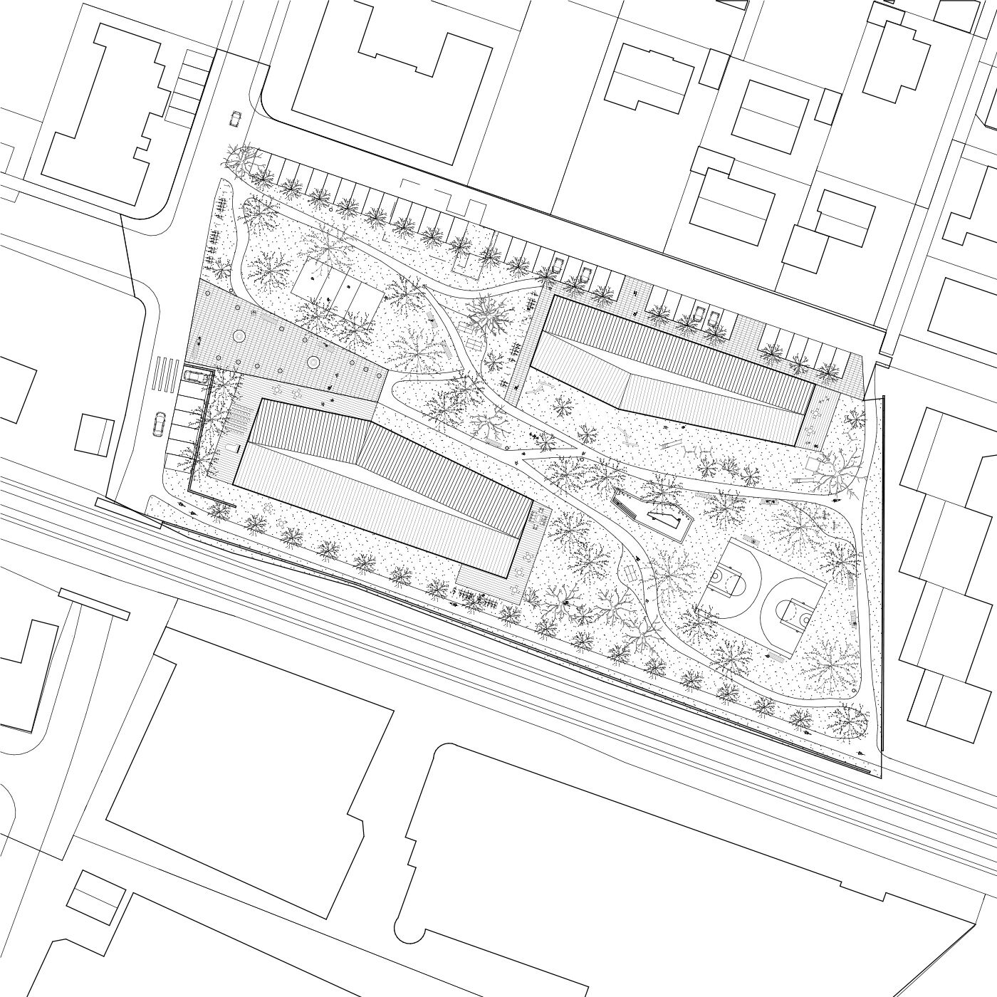 Zwei Häuser, das Mehrgenerationenhaus als offenes Haus und die Kindertagesstätte als schützende Behausung, stehen innerhalb des Bürgerparks in Beziehung zueinander und spannen einen städtebaulichen Raum auf. Das Gesamtensemble wird zum zentralen öffentlichen Ort der Begegnung und ist zugleich ein räumliches Gelenk, das von der Ortsmitte zum Quartier Mühlkanal überleitet und die beiden getrennten Bereiche Bürgerpark und Schachenmayr-Areal als Bindeglied zusammenführt.