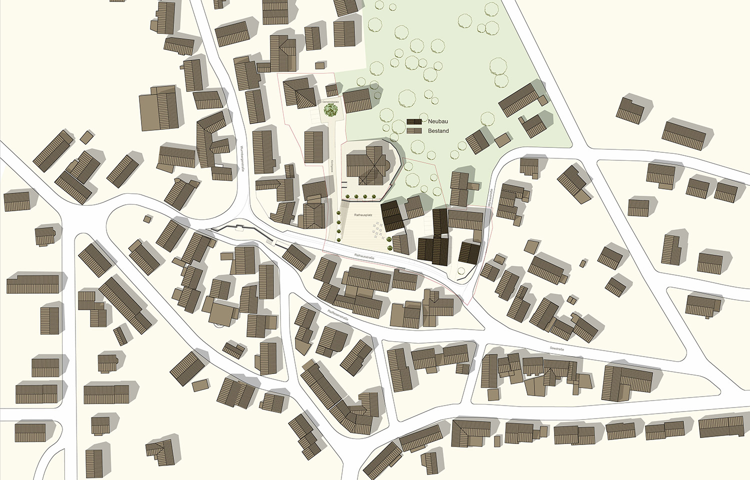 Der neue Rathausplatz schafft den erlebbaren Ortskern von Wimsheim. Am Platz befinden sich alle wichtigen identitätsstiftenden Gebäude wie Rathaus, Kirche, Diakonie, Bibliothek etc. Aus den bestehenden und neuen Gebäuden entsteht ein gestalterisches und funktionales Ensemble. Zusätzlich zu den öffentlichen Gebäuden wird er durch die im „Kirchenpostament“ befindlichen „Läden“, die je nach Bedarf Marktstände, kleine Verkaufsflächen oder Gastronomie beherbergen können, belebt. Auch die tribünenartige Treppe prägt als Gestaltungselement den individuellen Charakter des Platzes.