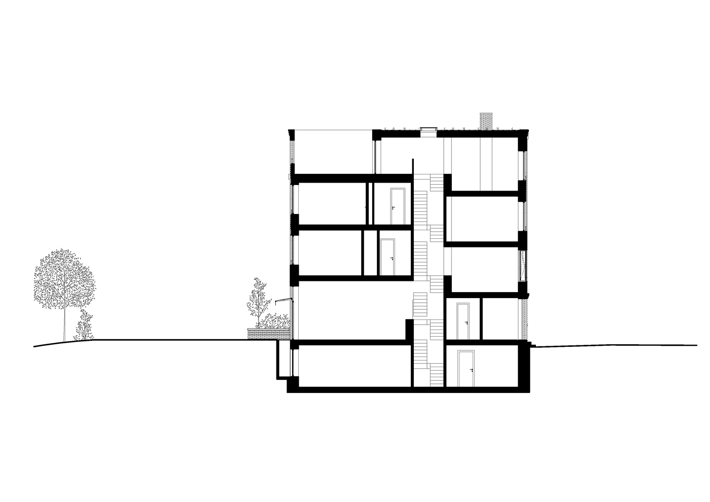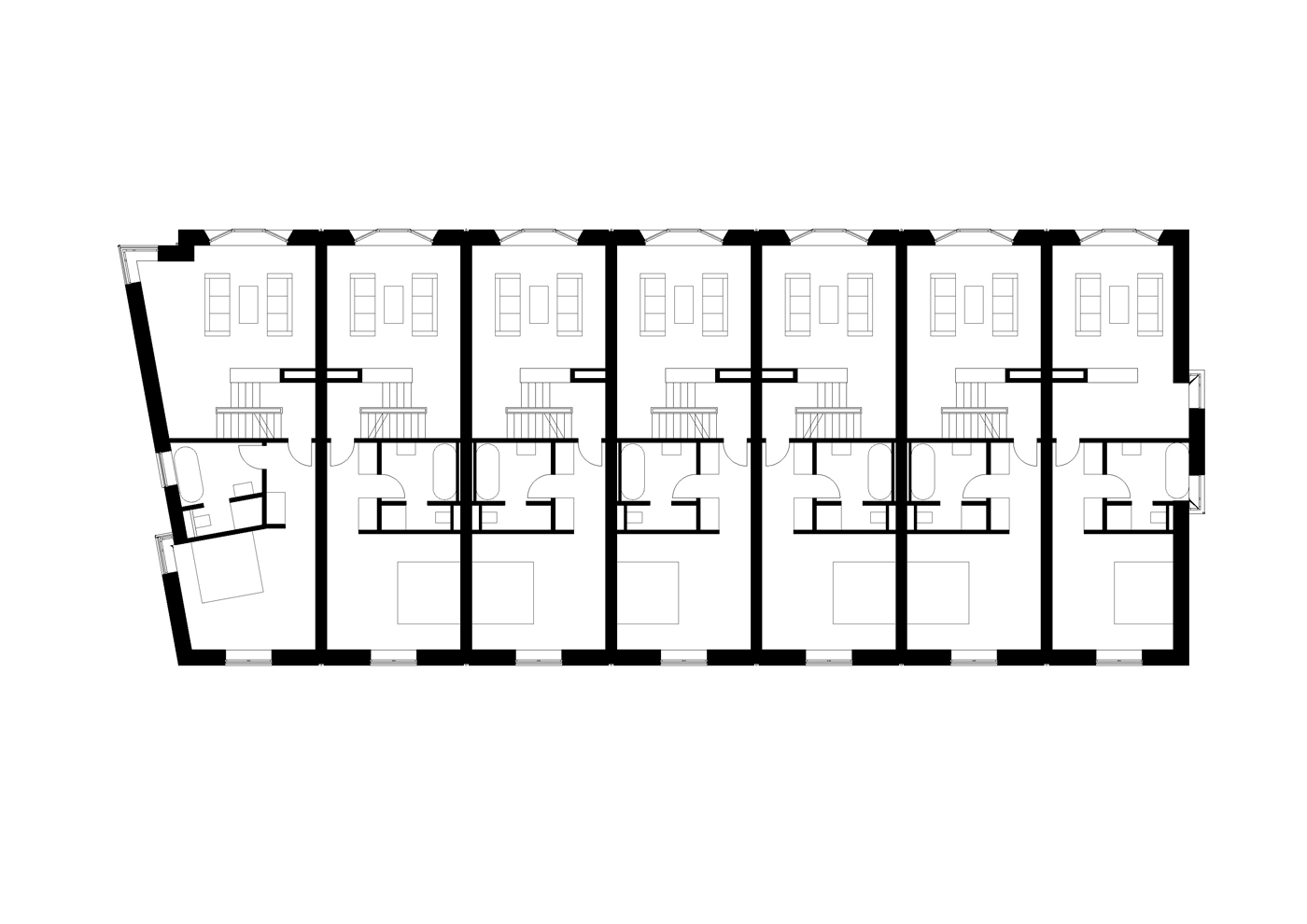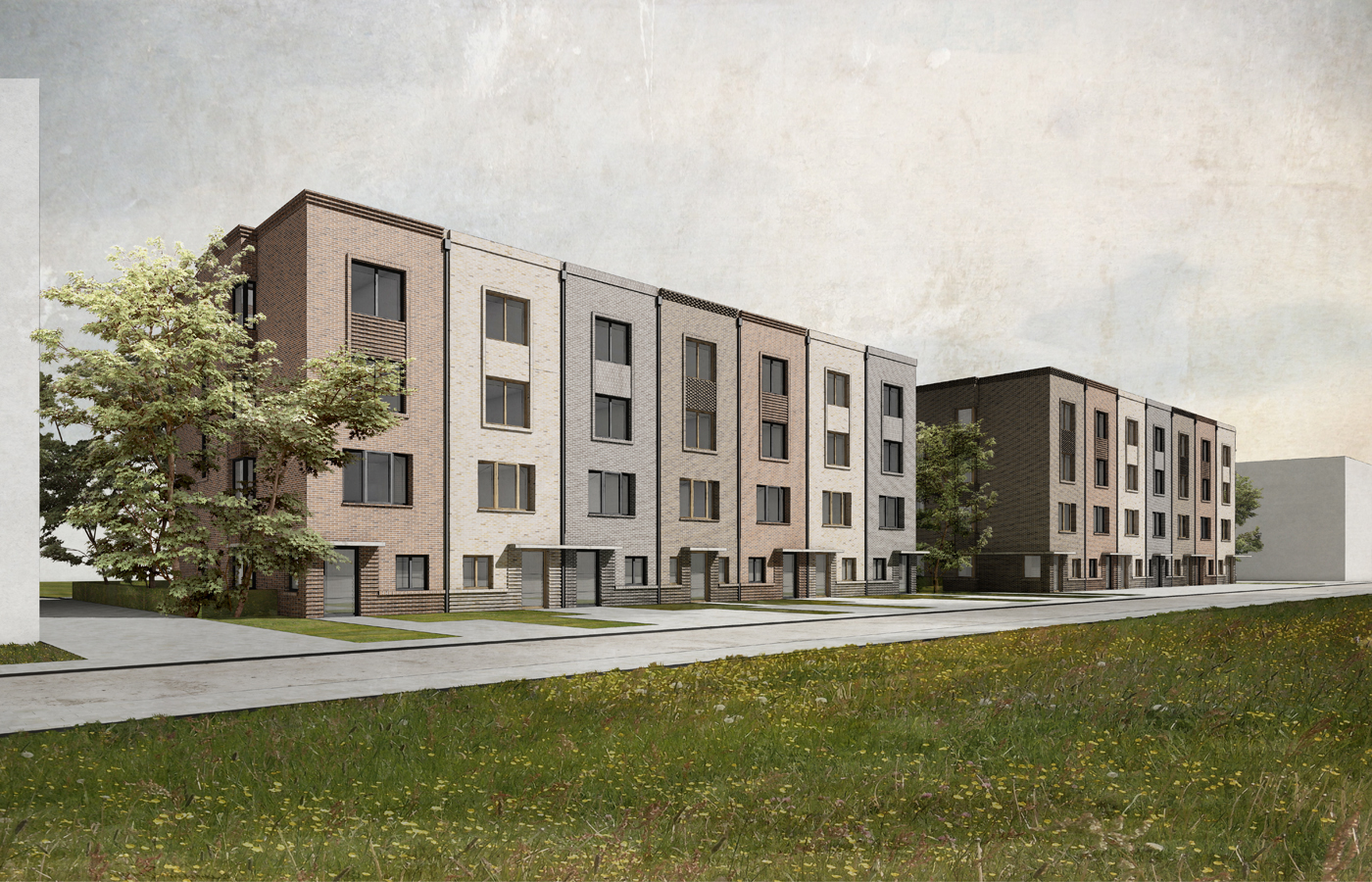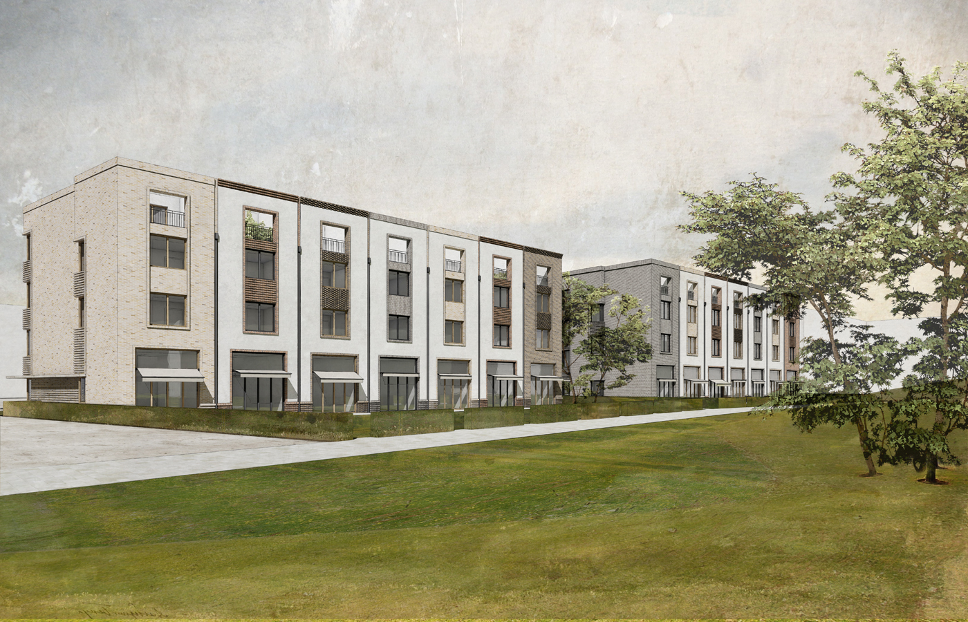 Die Reihenhäuser werden in massiver Baukonstruktion mit drei Vollgeschossen, einem Staffelgeschoss und einem Kellergeschoss ausgebildet. Das Staffelgeschoss ist zur Gartenseite zurückversetzt. Die Reihenhäuser verfügen jeweils über eine Terrasse im Erdgeschoss sowie eine vierseitig umschlossene nach oben geöffnete Dachterrasse. Jedes Reihenhaus erhält einen Stellplatz im Vorgarten. Die Gebäude werden gemäß Bebauungsplan mit Klinker- und Putzfassaden ausgeführt.