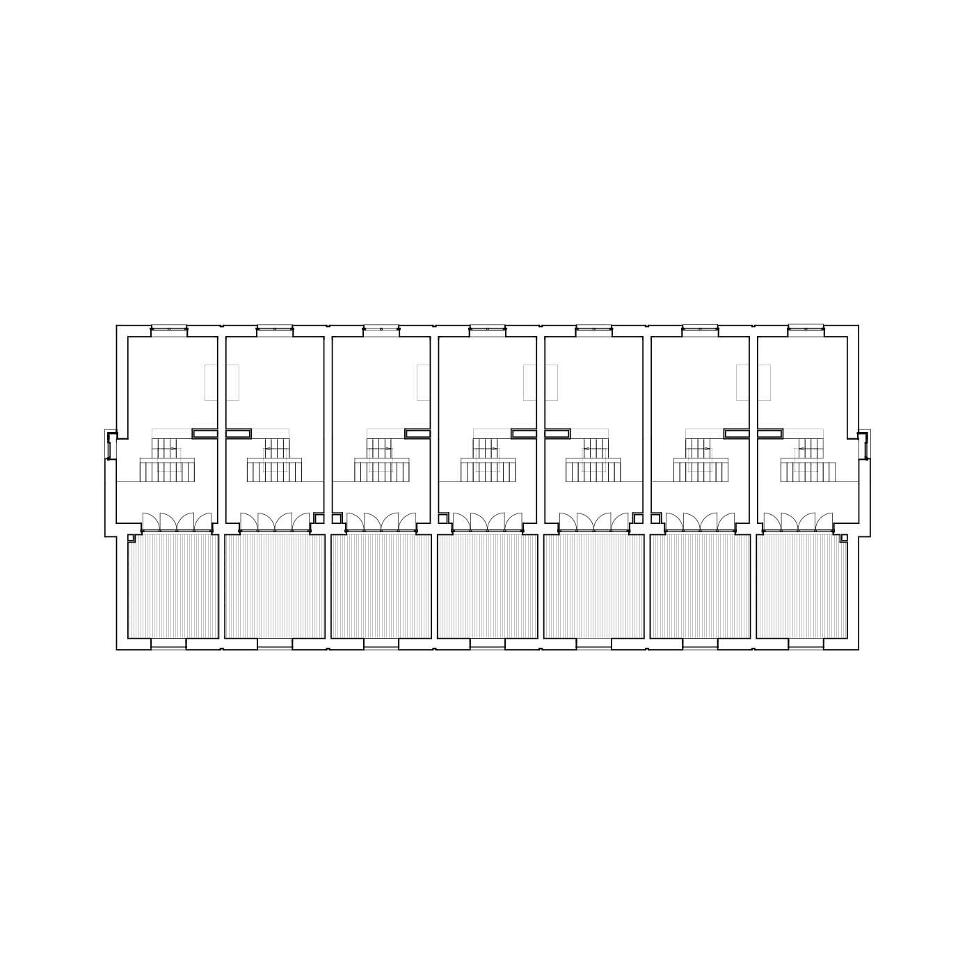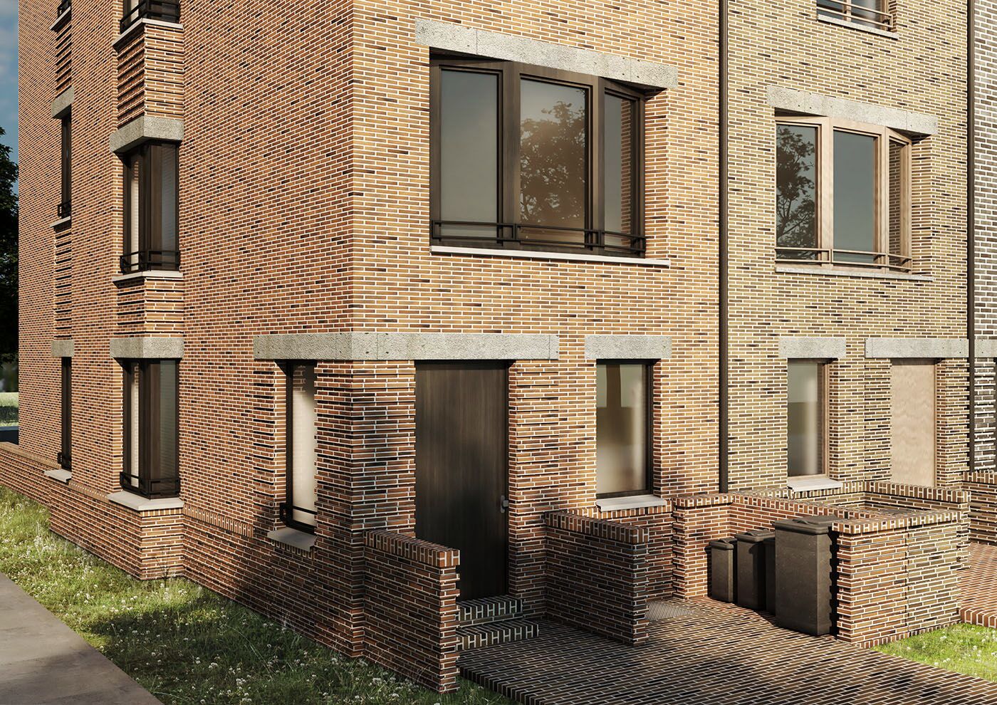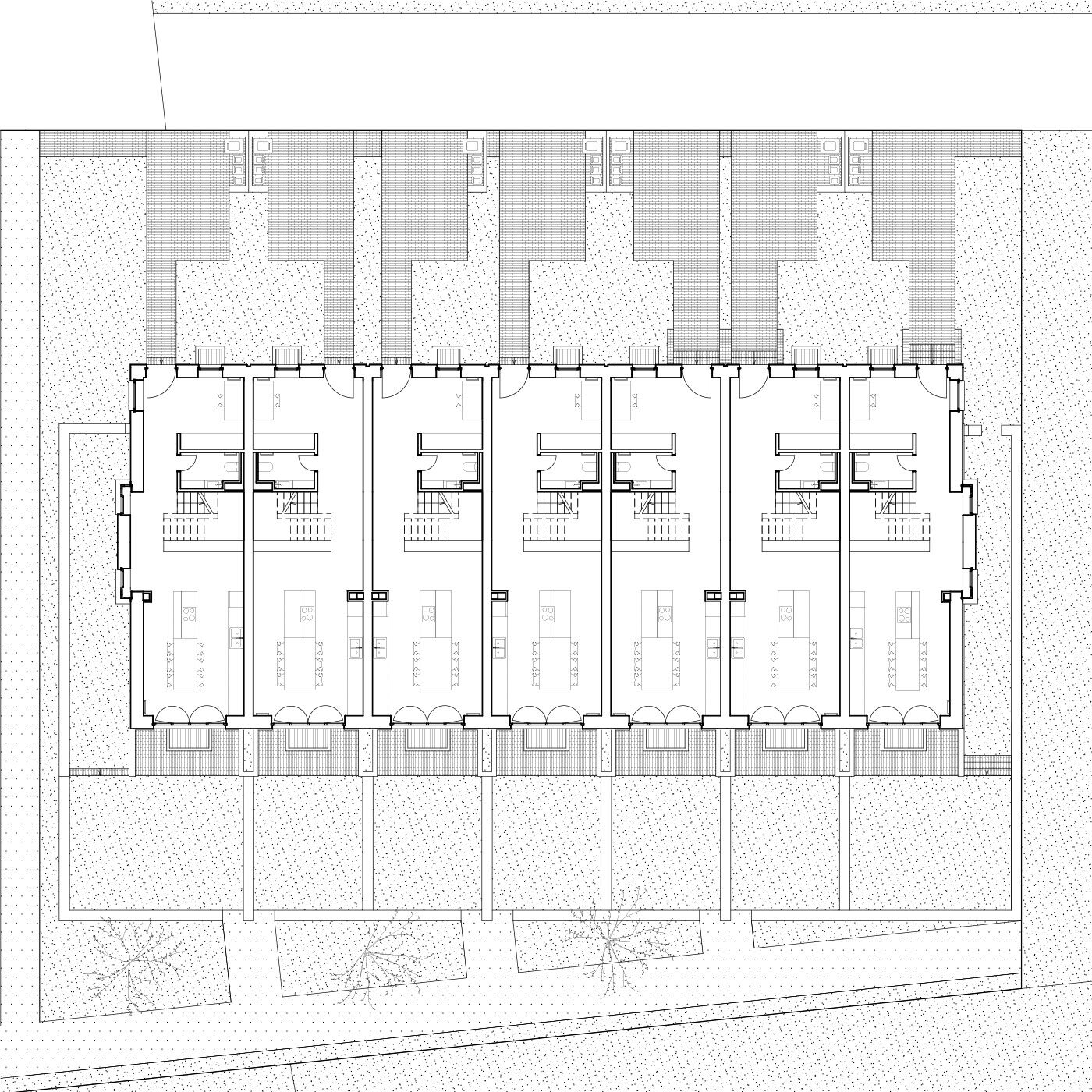 Zwei Zeilen mit jeweils sieben Reihenhäusern schließen den Blockrand im nördlichen Ringgebiet in Braunschweig. Der Entwurf bezieht sich auf die städtischen Brownstonehouses in New York, wodurch die eigentlich vorstädtische Reihenhaustypologie eine urbane Anmutung erhält. Das Ensemble wirkt, wie sein Vorbild, insgesamt einheitlich, eine Varianz wird durch Unterscheidungen im Detail der Backsteinprofilierungen und Farbigkeiten der Einzelhäuser erzeugt. Die Straßenseite mit ihren dunklen Backsteinfassaden nimmt Bezug zur industriellen Geschichte des Ortes auf, während helle Putzfassaden zur Hofseite eine wohnliche Atmosphäre schaffen. Das Splitlevel ermöglicht es, die besonderen Wohnbereiche eineinhalbgeschossig auszuführen.