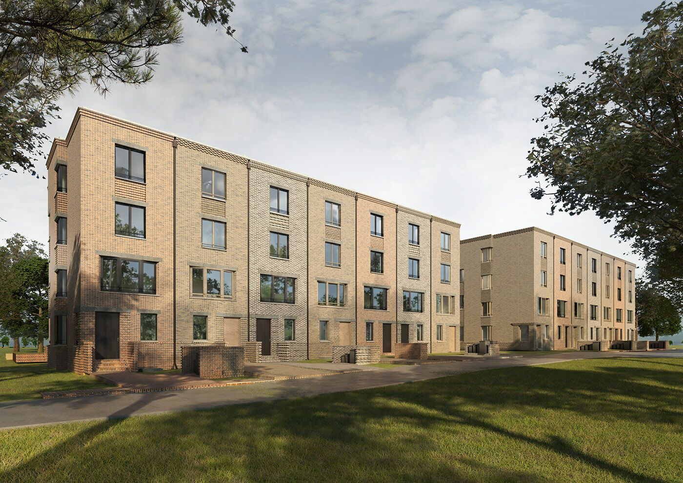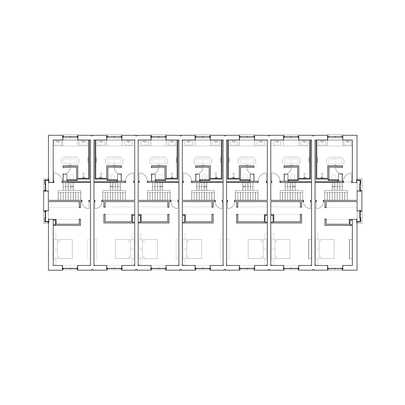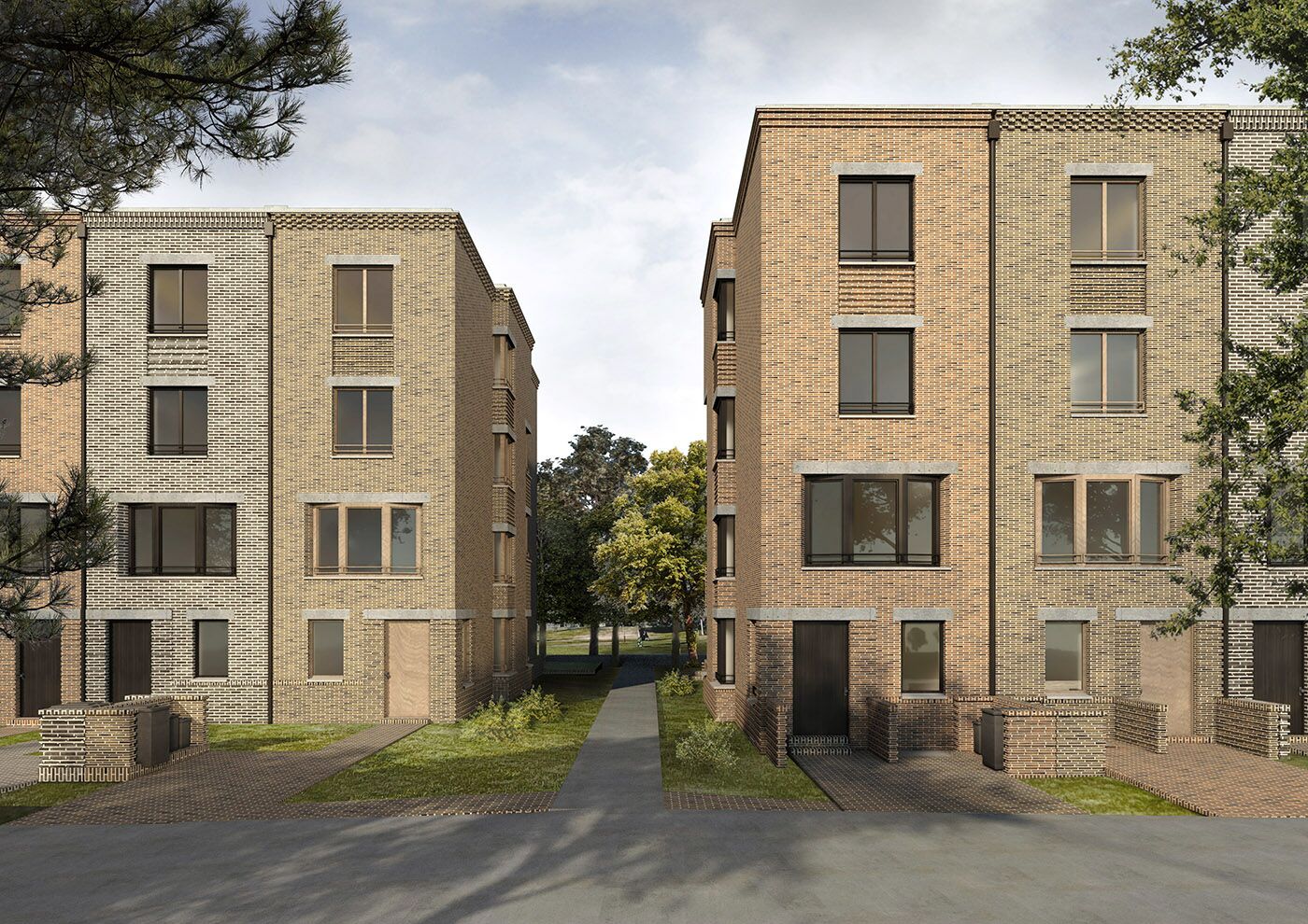 Zwei Zeilen mit jeweils sieben Reihenhäusern schließen den Blockrand im nördlichen Ringgebiet in Braunschweig. Der Entwurf bezieht sich auf die städtischen Brownstonehouses in New York, wodurch die eigentlich vorstädtische Reihenhaustypologie eine urbane Anmutung erhält. Das Ensemble wirkt, wie sein Vorbild, insgesamt einheitlich, eine Varianz wird durch Unterscheidungen im Detail der Backsteinprofilierungen und Farbigkeiten der Einzelhäuser erzeugt. Die Straßenseite mit ihren dunklen Backsteinfassaden nimmt Bezug zur industriellen Geschichte des Ortes auf, während helle Putzfassaden zur Hofseite eine wohnliche Atmosphäre schaffen. Das Splitlevel ermöglicht es, die besonderen Wohnbereiche eineinhalbgeschossig auszuführen.