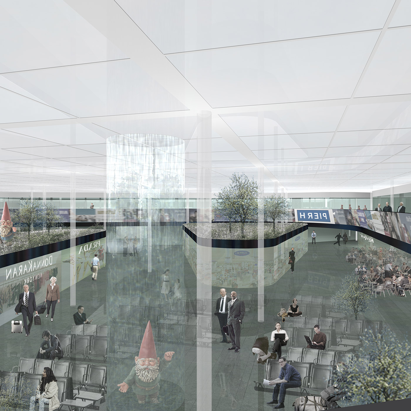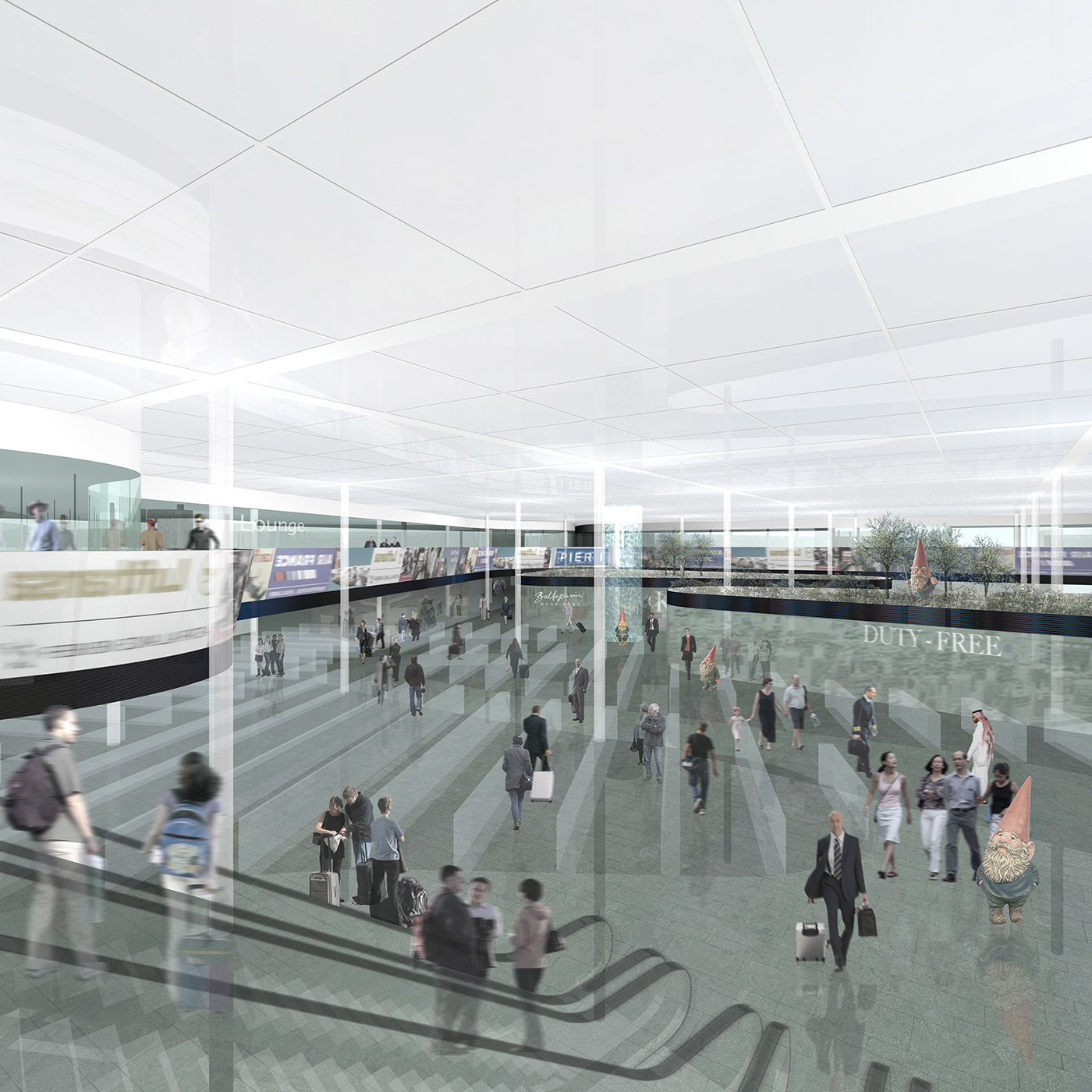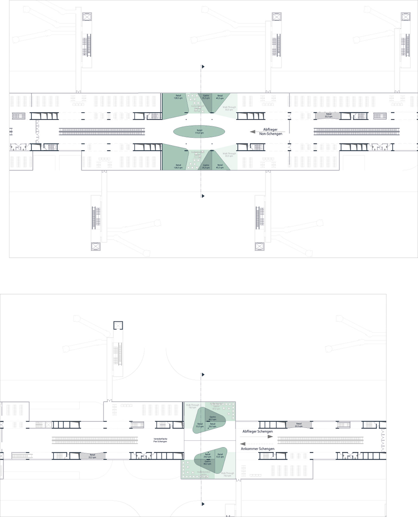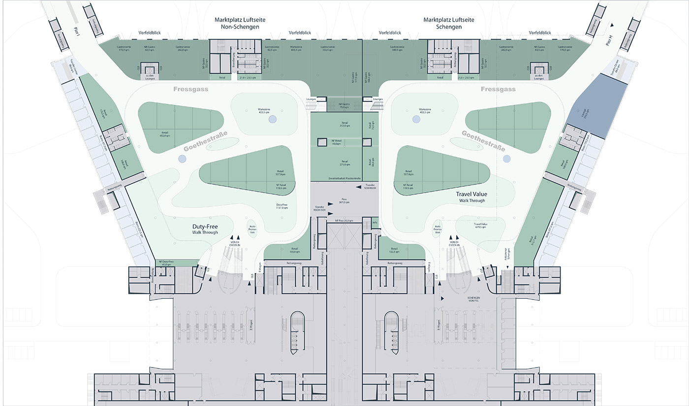 Das Konzept für die Retailbereiche des Terminal 3 am Flughafen Frankfurt basiert auf der Idee des großen Raumes, der durch freistehende Körper gegliedert wird. Dieser großzügige Raum wird als ‚Lichtung’ innerhalb der baulichen Dichte des Flughafenkomplexes verstanden. Ein umlaufendes Medienband zeichnet den großen zweigeschossigen Raum nach und schafft eine einzigartige Shopping- und Erlebnisatmosphäre. Die Passagiere und Besucher werden auf „gewundenen Wegen“ wie selbstverständlich durch die Einkaufs- und Erlebniswelt sowie zu den Warte- und Erholungsflächen geführt. Die Marktplätze bieten zahlreiche Verkaufs-Loops, die zum Flanieren animieren.
