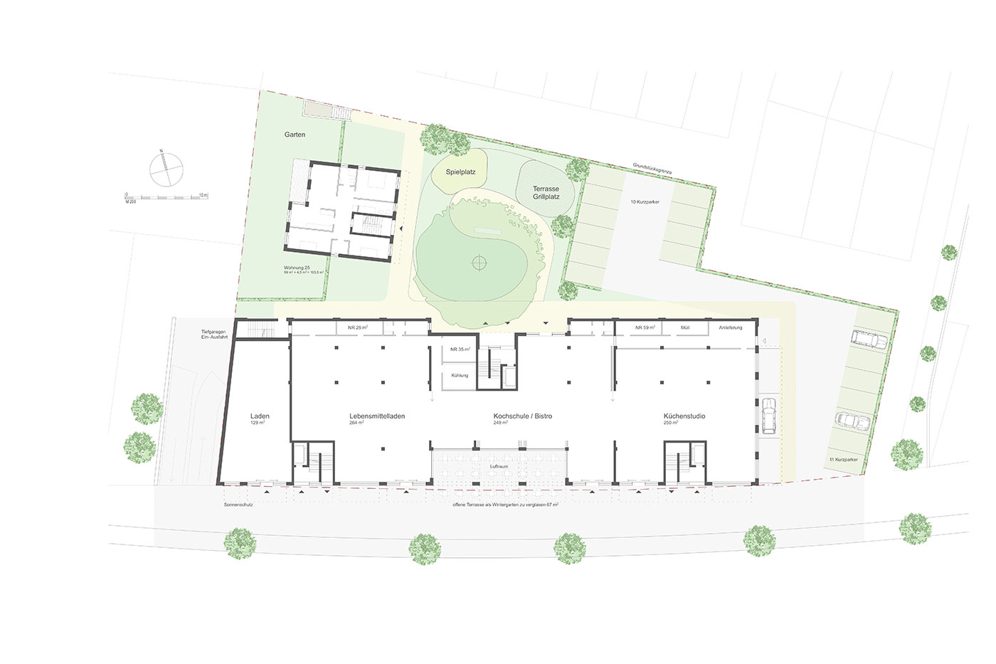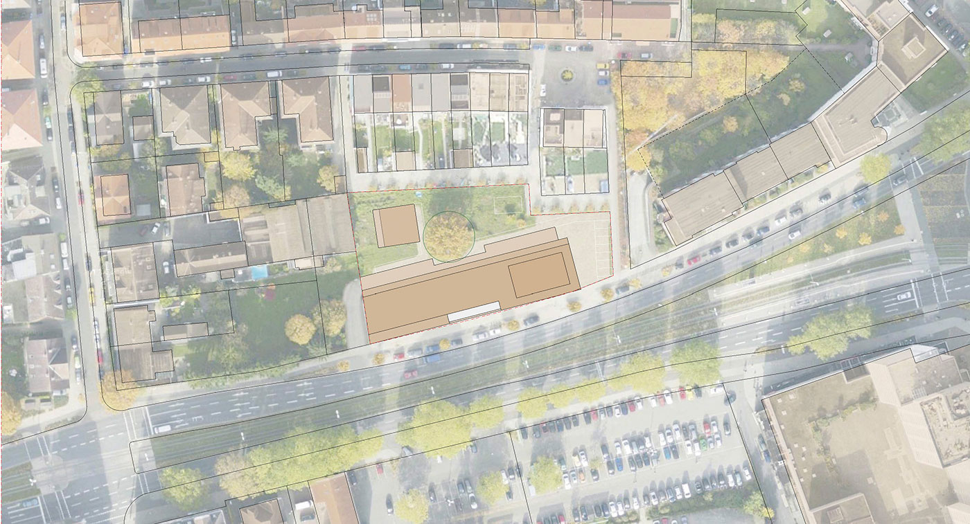 Planungsstudie für ein Gebäude mit Wohn-, Laden- und Büroflächen und ein Wohngebäude auf gemeinsamer Tiefgarage im Bahnhofsumfeld