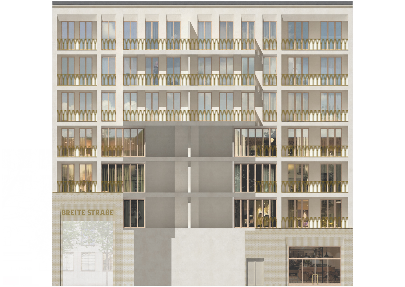 Das Torhaus wird als Teil der neuen Blockrandbebauung an der Breiten Straße als städtisches Wohnhaus mit repräsentativer Straßenfassade und informeller Hoffassade geplant. Der Fassadenentwurf basiert auf dem Berliner kaiserzeitlichen Wohnhaus mit dem klassischen Aufbau aus überhöhtem Erdgeschoss, plastisch ausgearbeitetem Mittelteil und oberem Abschluss durch Ausbildung einer Dachkante mit Attika. Im Gegensatz zu der Putzfassade der Obergeschosse wird die Besonderheit des Erdgeschosses durch geschlämmten Klinker hervorgehoben. Um das Gebäudevolumen in die Maßstäblichkeit typischer Berliner Stadthäuser zu übertragen, werden altbekannte Elemente städtischer Häuser integriert und neu interpretiert.