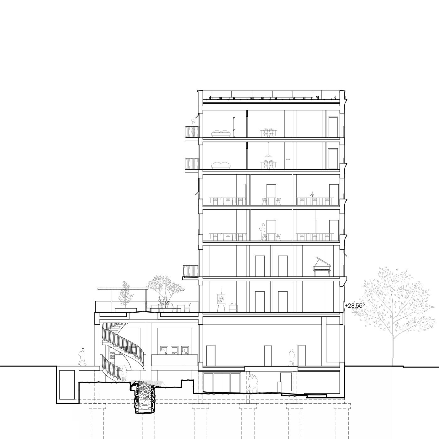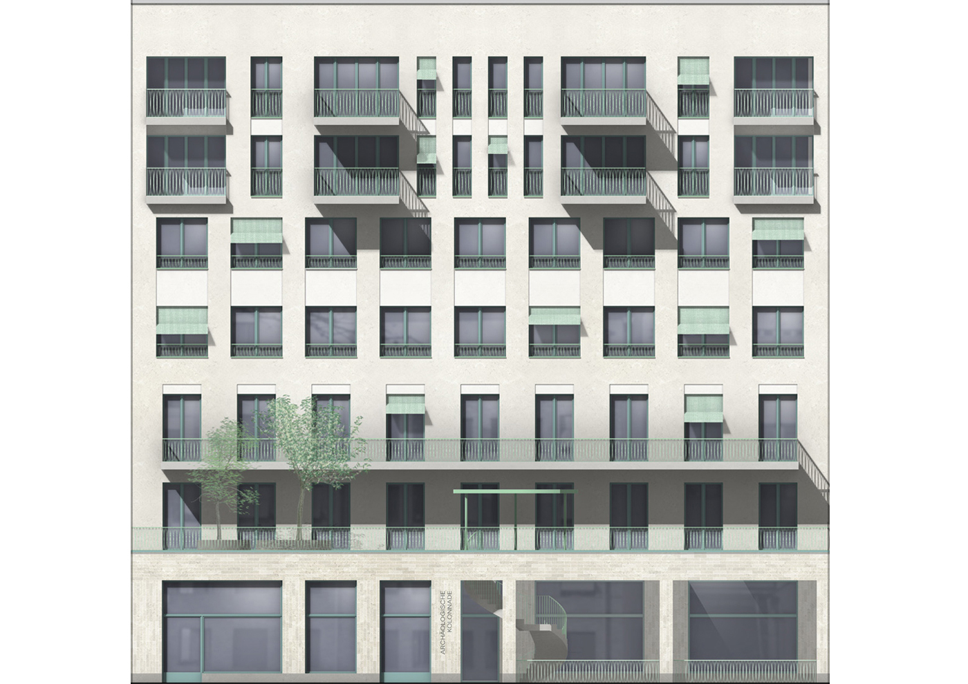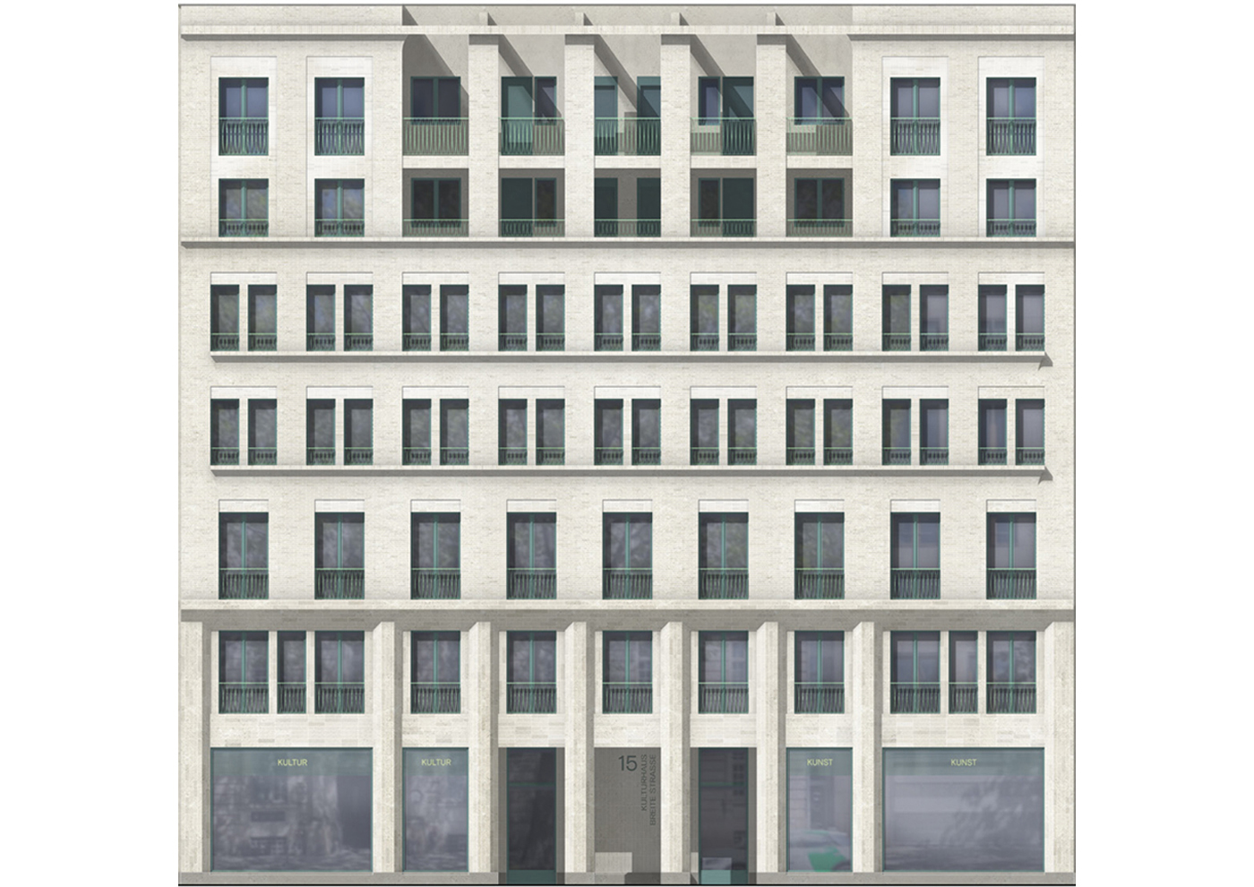 Der Neubau wird entsprechend der Lage als Mittelhaus in der Blockrandbebauung an der Breiten Straße als städtisches Wohn- und Kulturhaus mit repräsentativer Straßenfassade und informeller Hoffassade geplant. Eine eingeschossige Hofbebauung ermöglicht eine Vergrößerung der Gewerbeflächen, die Integration der archäologischen Funde sowie die Nutzung des Dachgartens als losübergreifende Spielplatz- und Aufenthaltsfläche für die Bewohner*innen. Um das Gebäudevolumen in die Maßstäblichkeit typischer Berliner Stadthäuser zu bringen, werden altbekannte Elemente städtischer Häuser integriert und neu interpretiert.