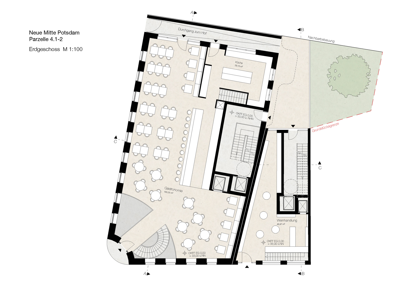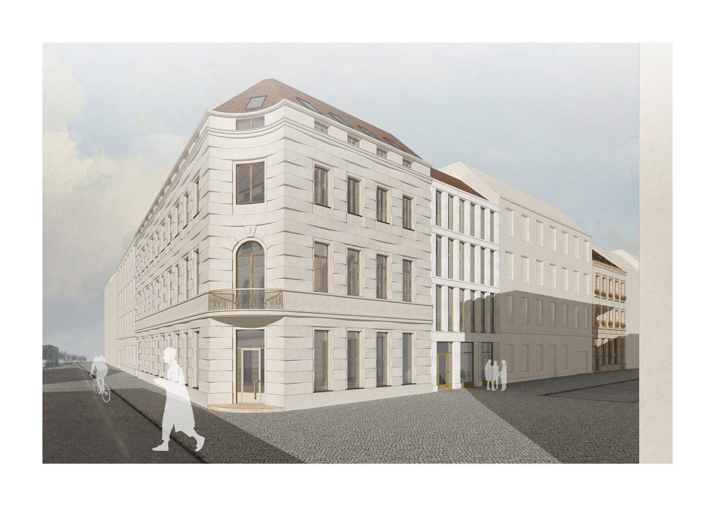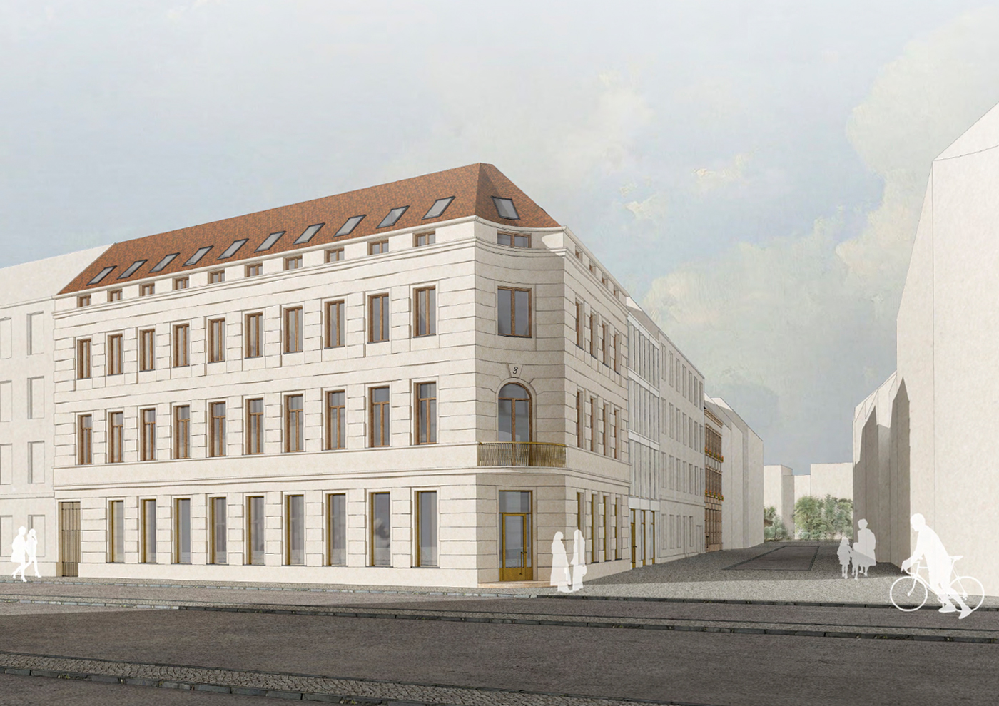 Größe gesamt: Eckhaus 1.685 m² BGF, Fugenhaus 444 m² BGF, 5-Achsen-Haus mit Remise 892 m² BGF