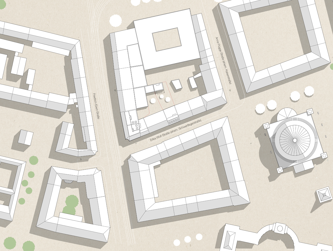 Vorrangiges städtebauliches Ziel ist die Wiedererschaffung des ehemaligen Bauensembles „Acht Ecken“ gemäß seinem historischen Vorbild. Diese Ensemblewirkung wird durch die charakteristische konkave Eckausbildung, die einheitliche Traufhöhe und Dachausbildung sowie die Aufnahme der gemeinsamen architektonischen Elemente Sockel, Gesims und Attika in einer Lochfassade erreicht und durch das Farbkonzept unterstützt. Gleichzeitig tritt das geplante eckständige Haus an der Straßengabelung Friedrich-Ebert-Straße / Erika-Wolf-Straße mit seinen drei Fassadenseiten als markanter Kopfbau und baulicher Auftakt zum Block IV in Erscheinung und hat mit dem geplanten gegenüberliegenden Eckhaus darüber hinaus eine Torwirkung zur Erika-Wolf-Straße und zum neuen Quartier.