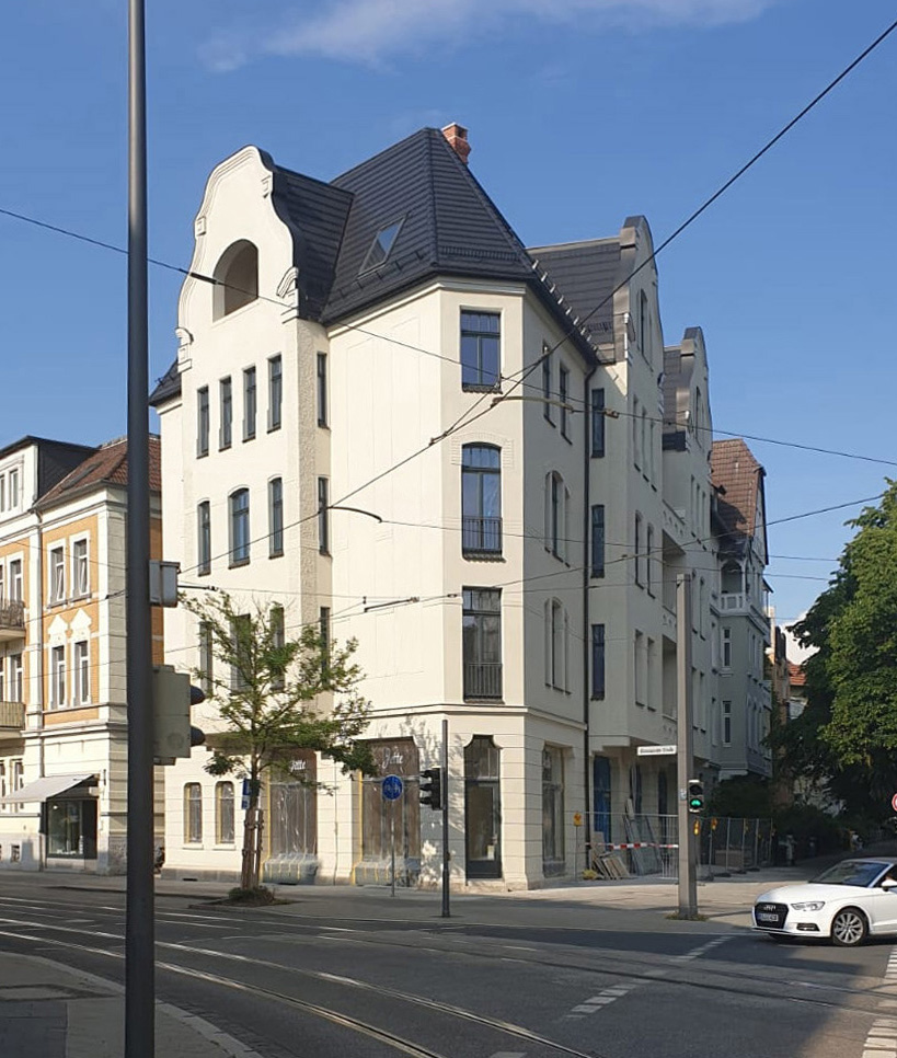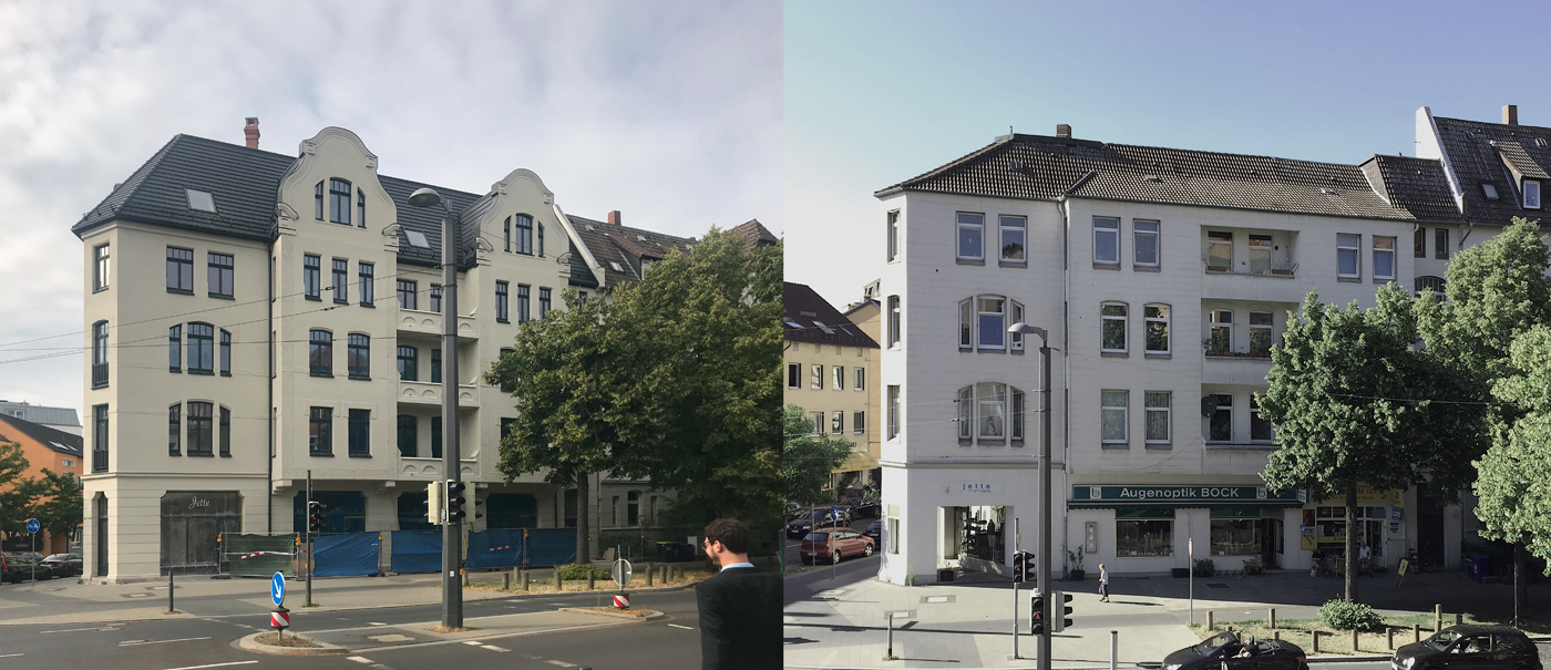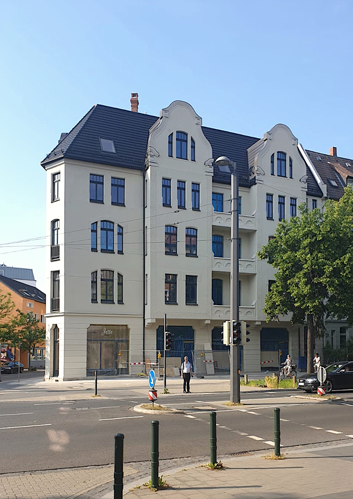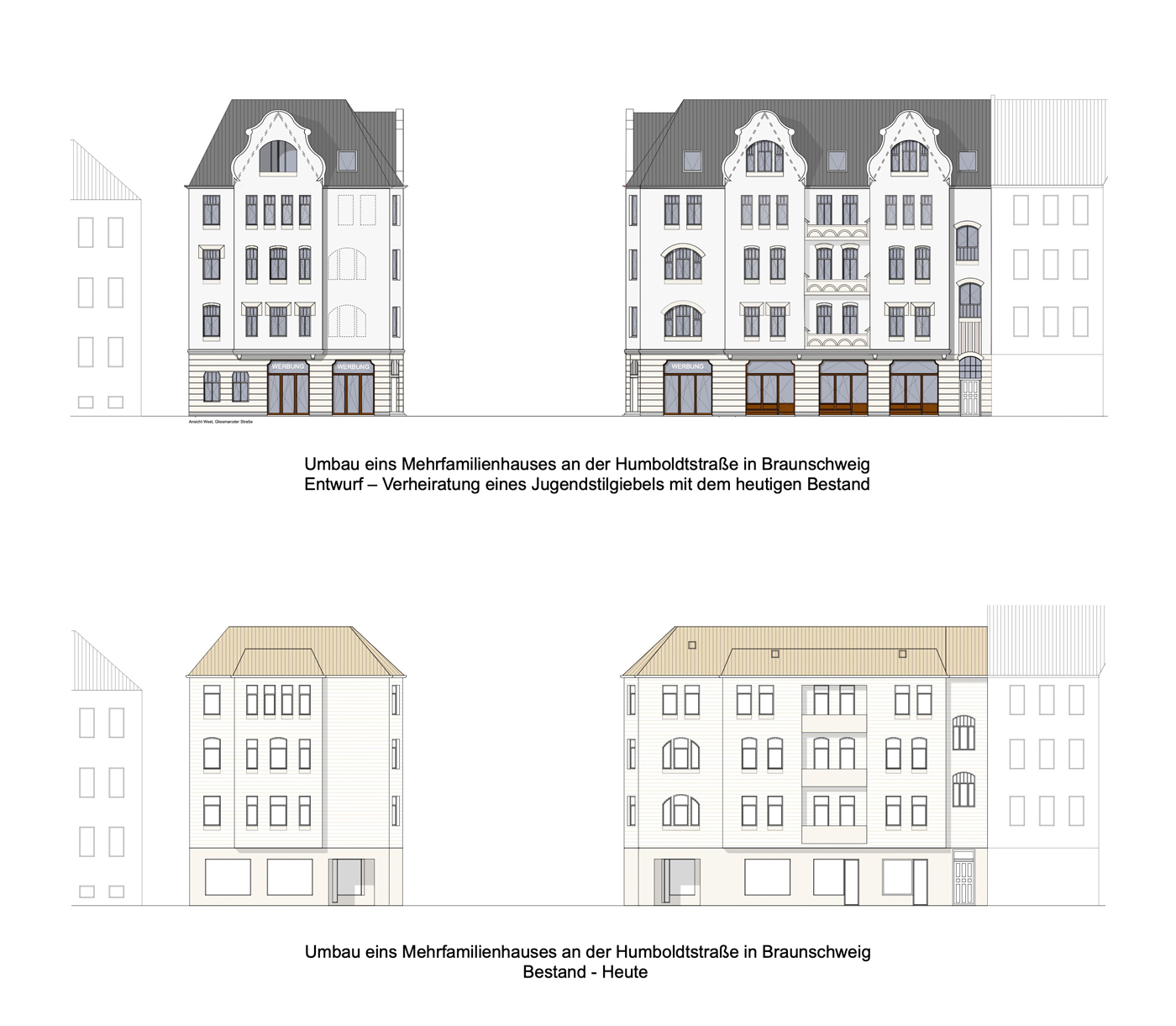Das Gründerzeithaus liegt exponiert auf einem spitz zulaufenden Grundstück zwischen Gliesmaroder Straße und Humboldtstraße. Das Konzept sah nicht nur die qualitativ hochwertige Sanierung der Bestandswohnungen vor, sondern auch die eher ungewöhnliche Maßnahme, die im Erdgeschoss vorhandenen Ladeneinheiten zu Wohneinheiten mit jeweils eigenem kleinen vorliegendem Gartenbereich umzunutzen. Durch die Neuerrichtung eines hohen Daches wurde zusätzlich Wohnraum geschaffen. Das Dach zeichnet sich besonders durch drei aufwendig gestaltete Zwerchhäuser aus. Die Zwerchhäuser wurden bewusst nicht dem historischen Bestand nachempfunden, sondern dem Entwurfsprinzip des Reproduktiven Entwerfens folgend einem Wohnhaus in Frankfurt.