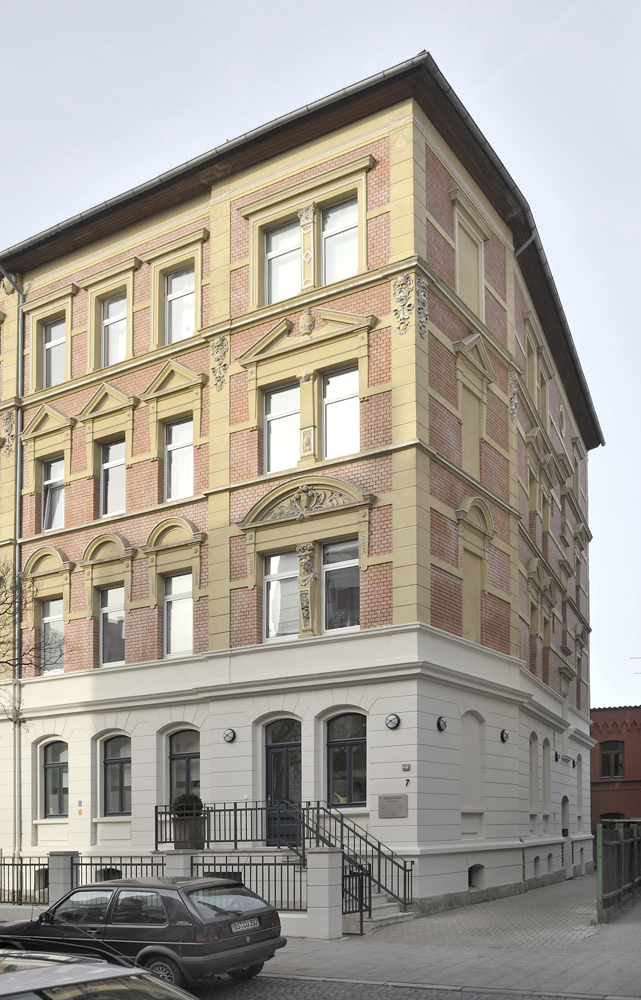 In einem Mehrfamilienhaus aus der Zeit um die Jahrhundertwende wurde das Dachgeschoss zu zwei Wohneinheiten ausgebaut und in einer bestehenden Fensteröffnung des Hochparterres ein zusätzlicher Eingang zu den Räumen einer Zahnarztpraxis wieder hergestellt. Dies entstand in Anlehnung an einen hier früher existierenden Eingang zu einem Frisörsalons. Die neue Eingangsanlage besteht aus einer einläufigen entsprechend der Sockelausbildung massiven Treppe mit Podest und einer Holztüranlage, die sich gestalterisch an den historischen Bestandsfenstern orientiert.